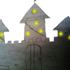 A stylized castle with gray stone walls and three towers, each featuring triangular windows glowing in yellow. The castle's entrance is arch-shaped, adding to its medieval charm.