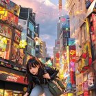 A vibrant city scene with retro aesthetics, showcasing a colorful vintage car parked on a bustling street filled with neon signs, tall buildings, and people enjoying the lively atmosphere.