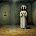 Prompt: "Jesus. crying in the prison (((showers))), huddled in the corner and a big Bubba, semi naked, stood over him.