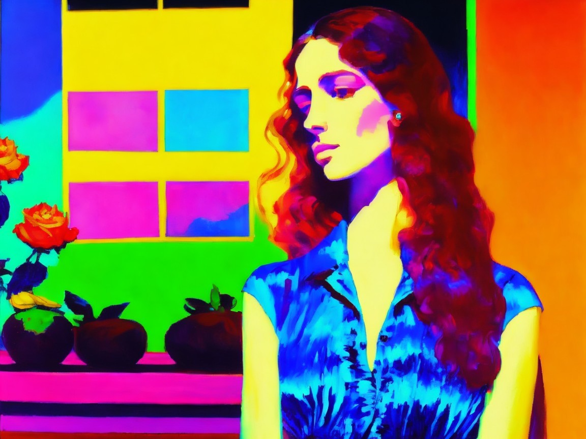 A young woman with long, flowing brown hair gazes thoughtfully toward the viewer. She wears a vibrant blue shirt, set against a colorful, abstract background featuring large windows and flowers.