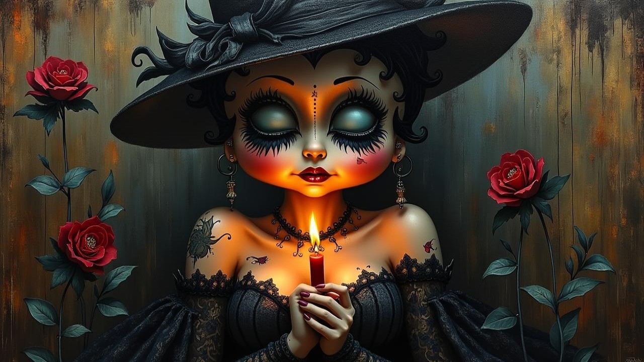 A charming, stylized character with big eyes and curly hair wears a wide-brimmed hat and elegant black gloves. She holds a glowing candle, surrounded by lush roses and framed by an ornate background.