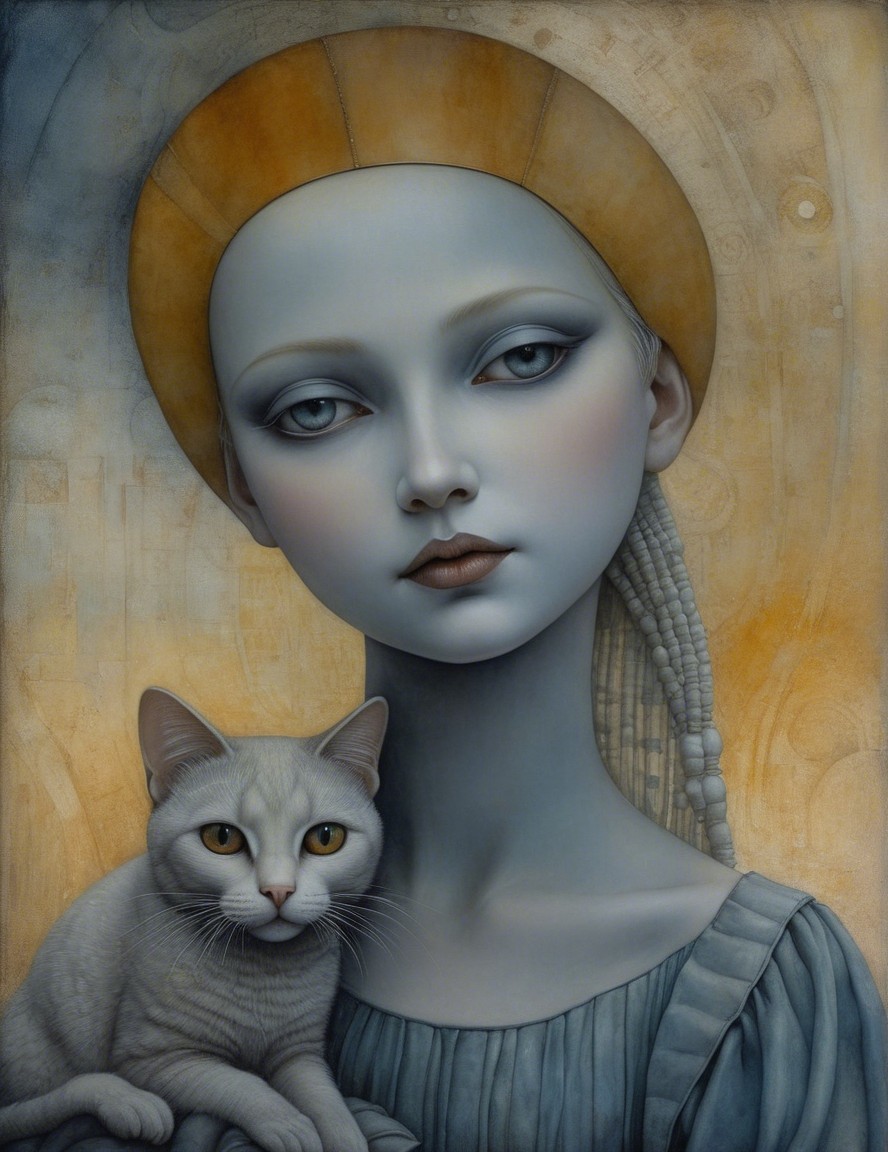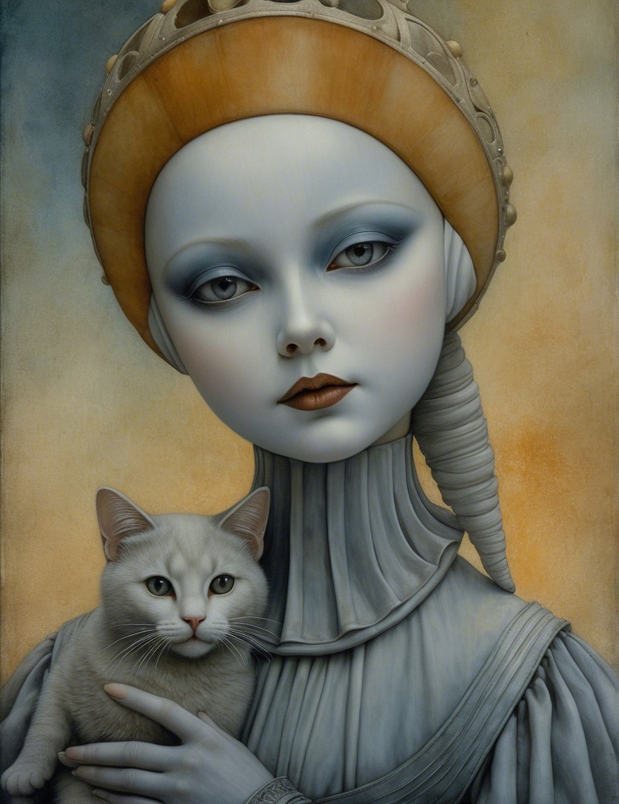 The image features a striking figure with porcelain-like skin and elaborate attire, highlighted by a unique cone-shaped headpiece. Her expression is serene, with bold makeup and intricate jewelry.