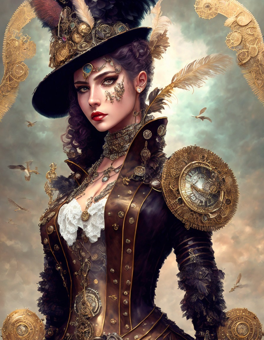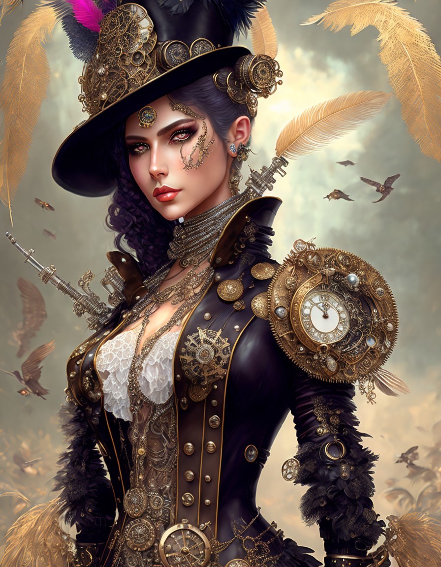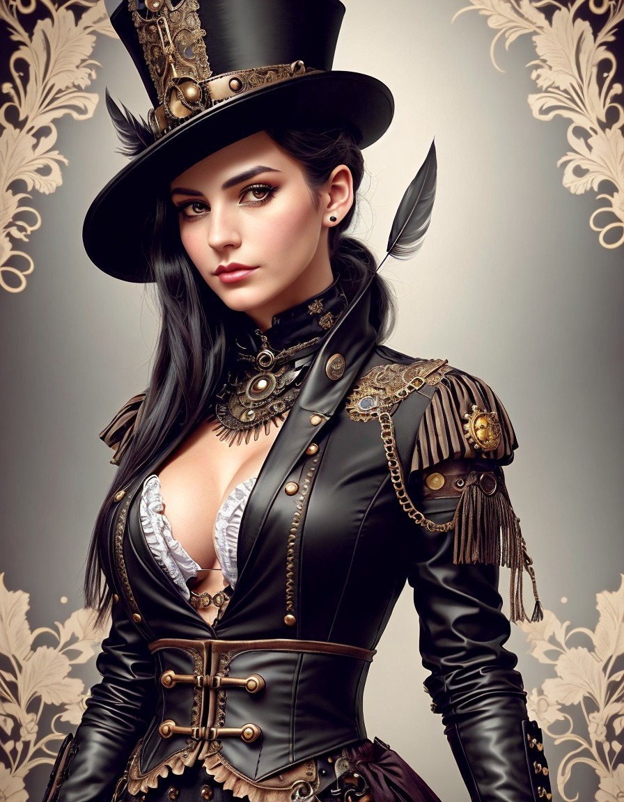 Prompt: "steampunk girl dressed in intricate and detailed sexy clothing adorned with gears and clocks. She wears long gloves and high boots, with a top hat embellished with feathers. In her hands, she holds a rifle decorated with steampunk elements, while a scarf flutters in the wind. Her gaze is determined, expressing adventure and cleverness.""