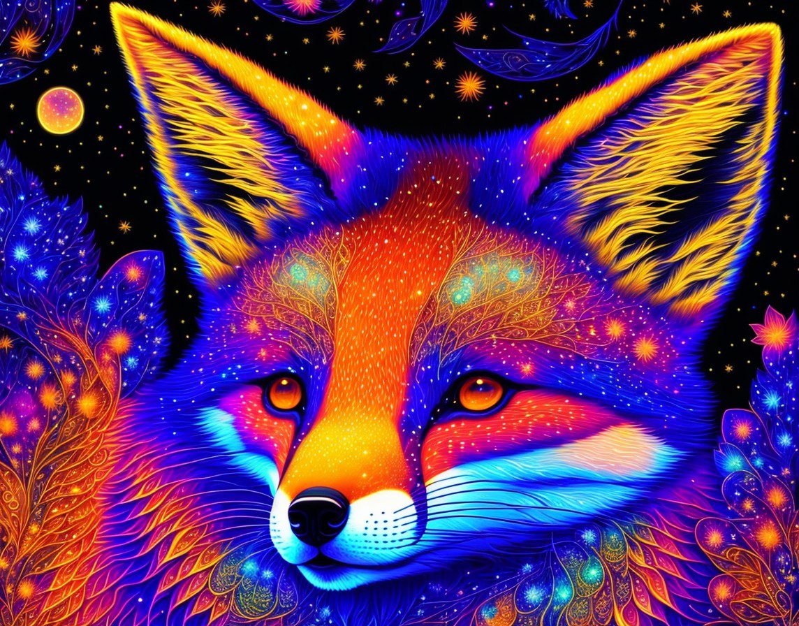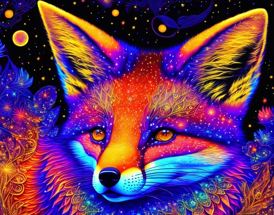 Prompt: symmetrical portrait of a psychedelic fox kit with a dark swirling cosmic background in the style of James R Eads. ultra detailed artistic illustration, midnight aura, night sky, dreamy, backlit