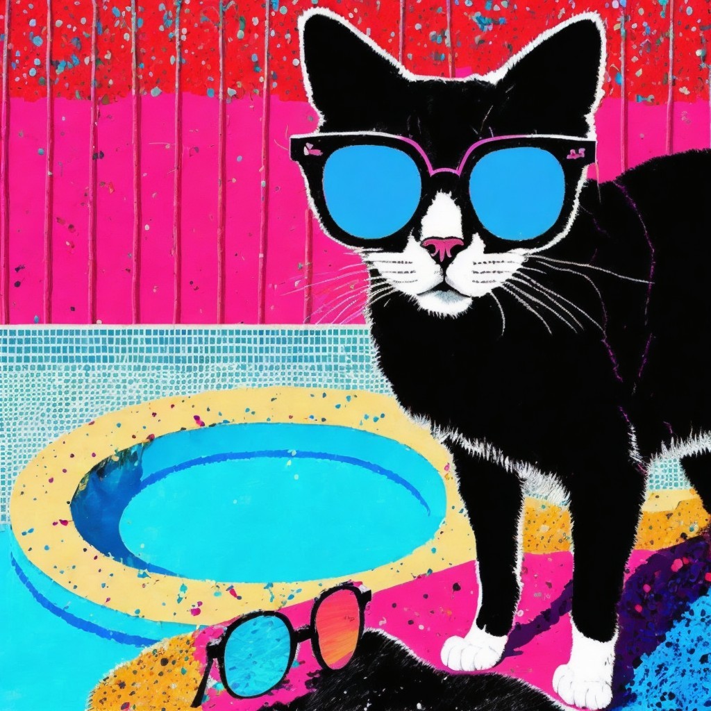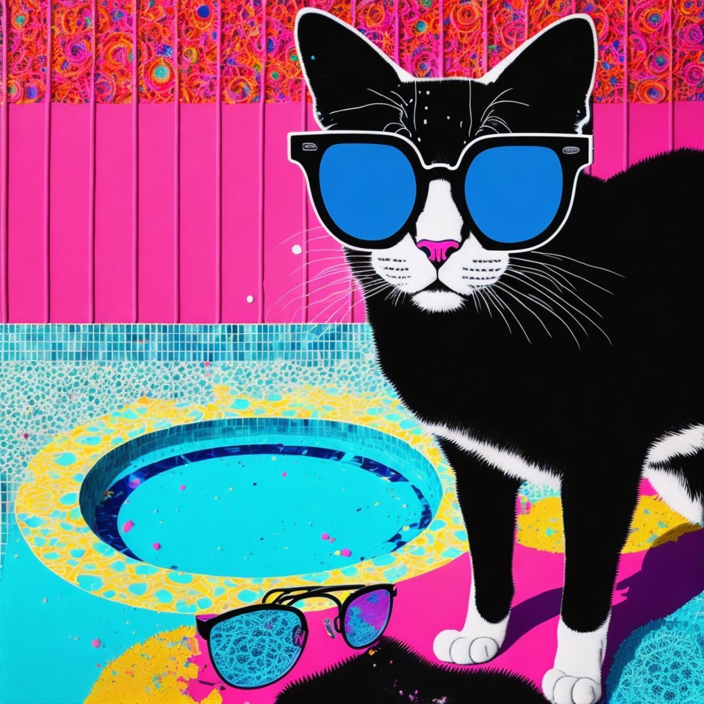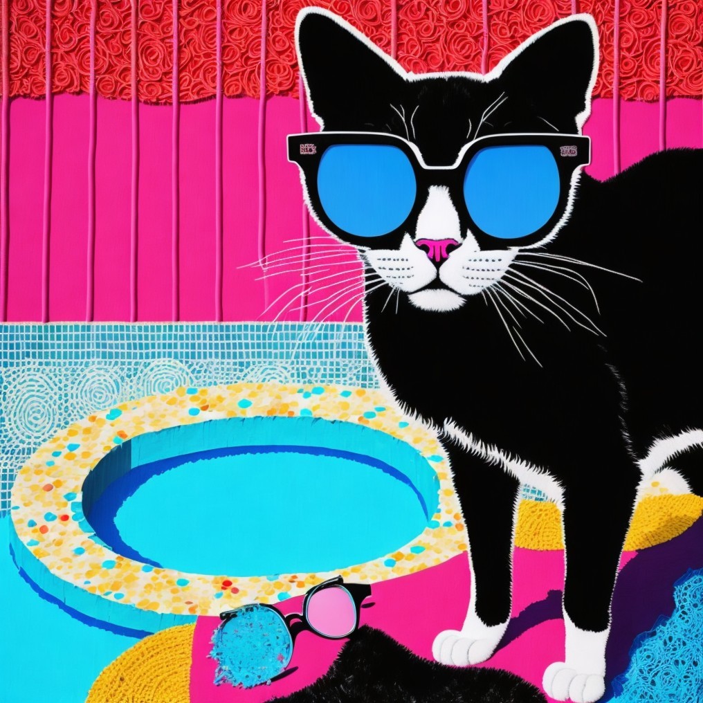 A sleek black cat, sporting bold blue sunglasses, lounges by a shimmering turquoise pool adorned with mosaic tiles. Surrounding it are colorful yarn balls and a pink textured backdrop, radiating the playful vibrance of a whimsical and punk-inspired summer scene.