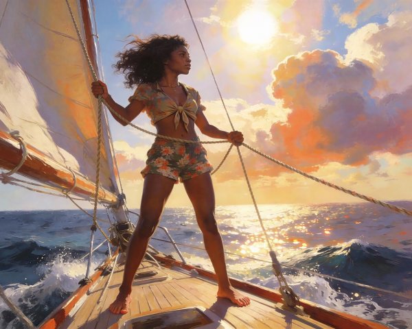 A full shot of an attractive barefoot woman in a revealing futuristic black dress with long sleeves sitting on the floor of a balcony, holding a cocktail glass with blue liquid in her hands, looking at it with a thoughtful expression. She is sitting with her legs crossed with her feet pointing to the left side of