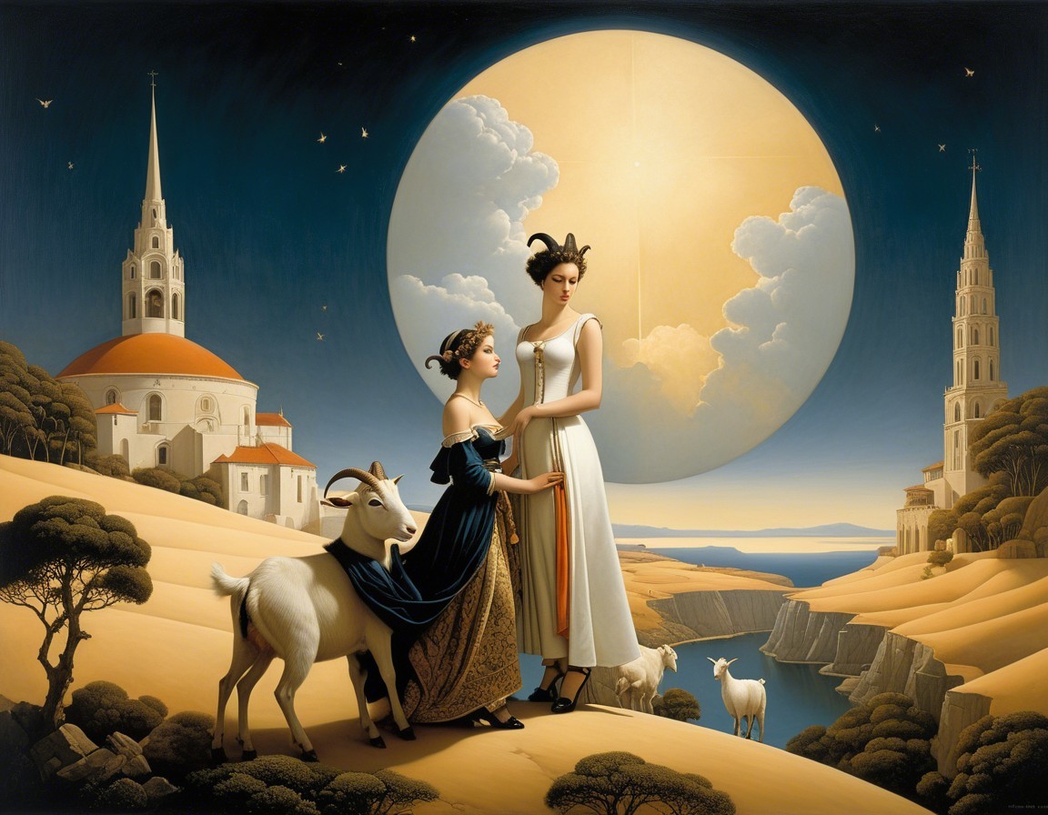 A woman in a flowing white dress stands on a stone path with a goat by her side, under a large moon. Surrounded by a picturesque village and serene coastal cliffs, the scene is mystical and enchanting.