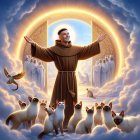 An angelic scene depicts a joyful figure in a brown robe, surrounded by cats and ethereal beings, with radiant gates opening to a heavenly realm filled with light and serenity.