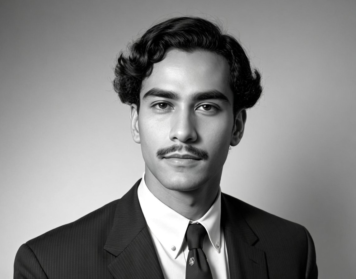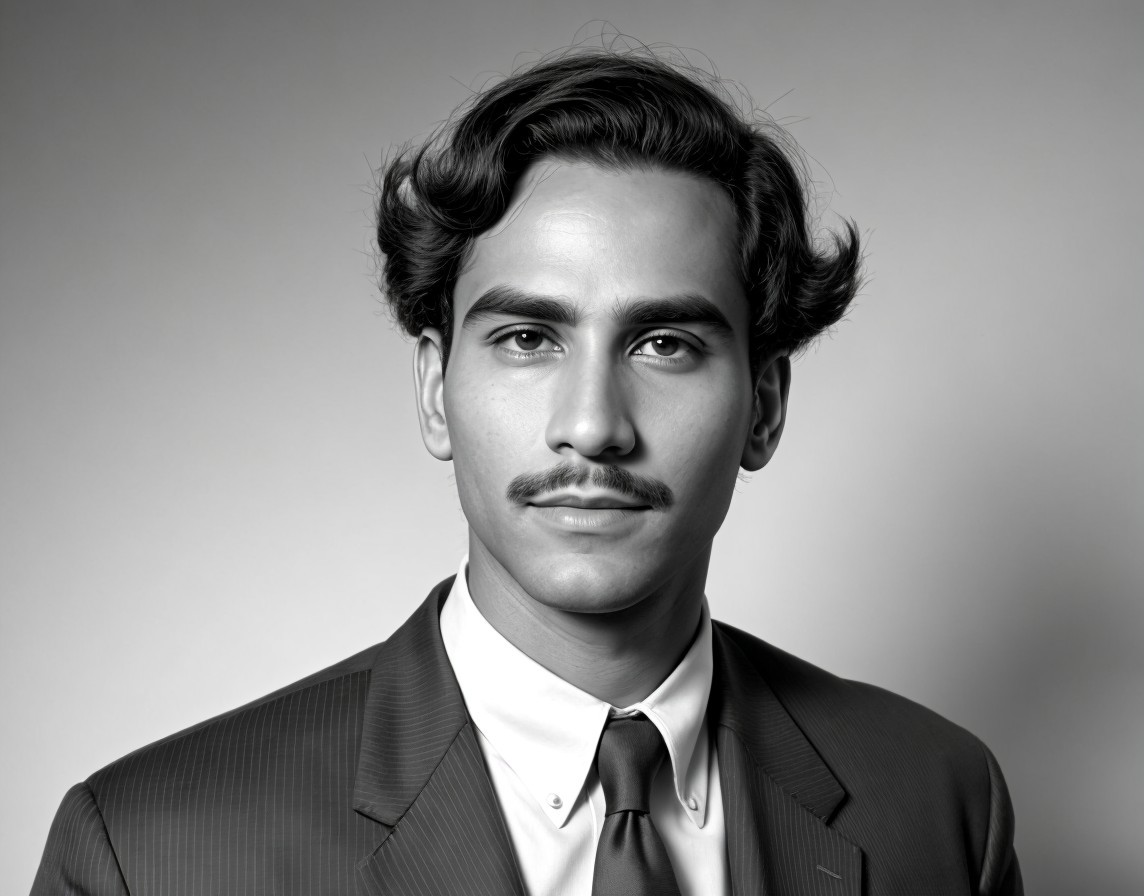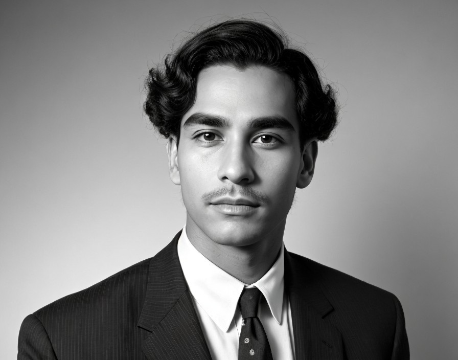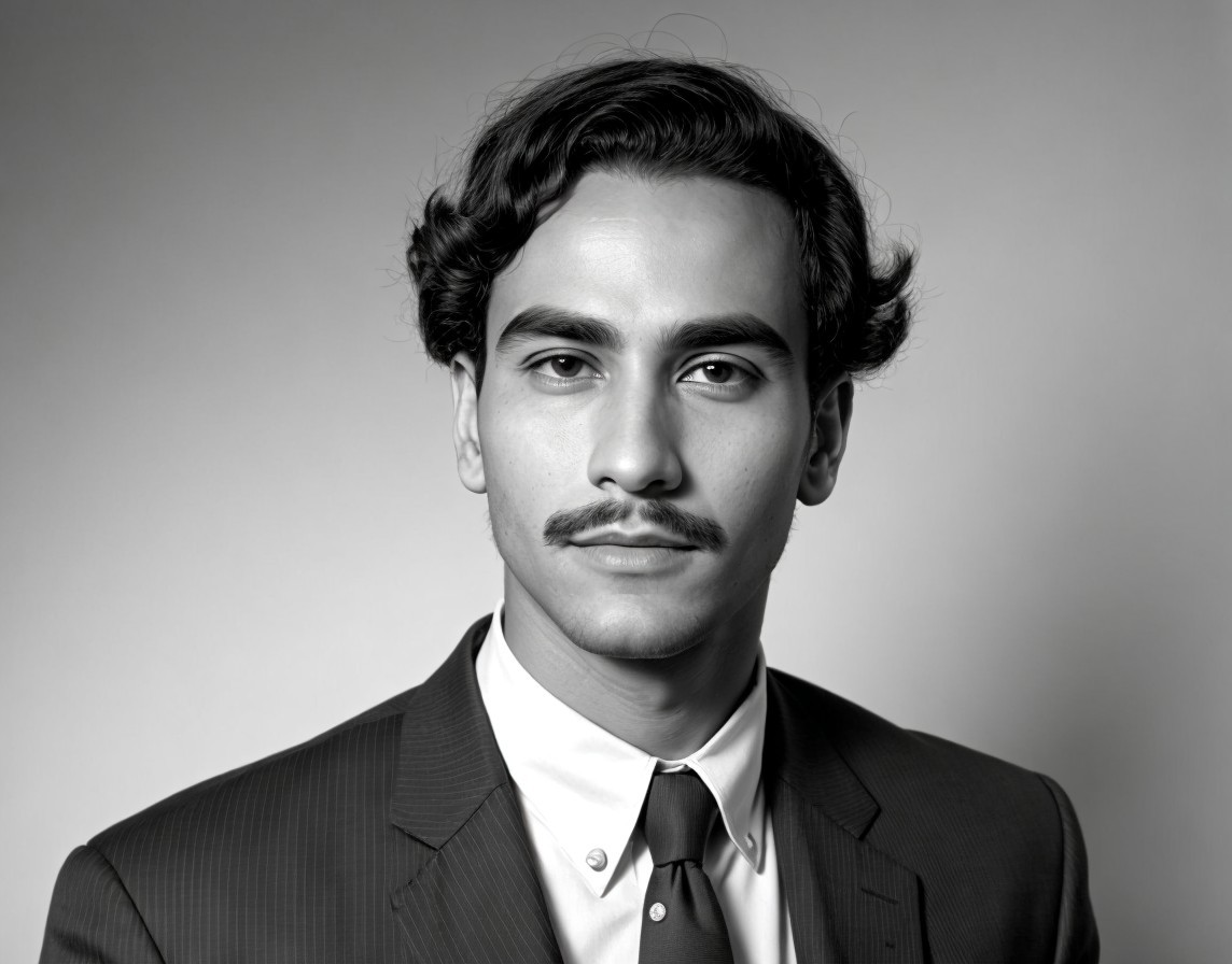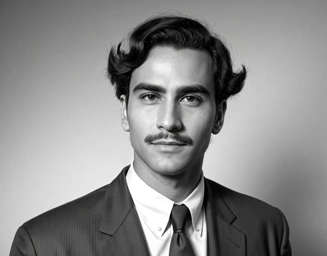 Monochrome portrait of a man with mustache and wavy hair in suit and tie