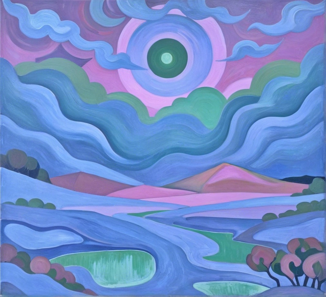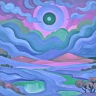 A vibrant, abstract landscape in soothing blues and purples. Curved hills and flowing rivers are framed by swirling clouds, under a glowing, circular orb that suggests a serene sunset or sunrise.