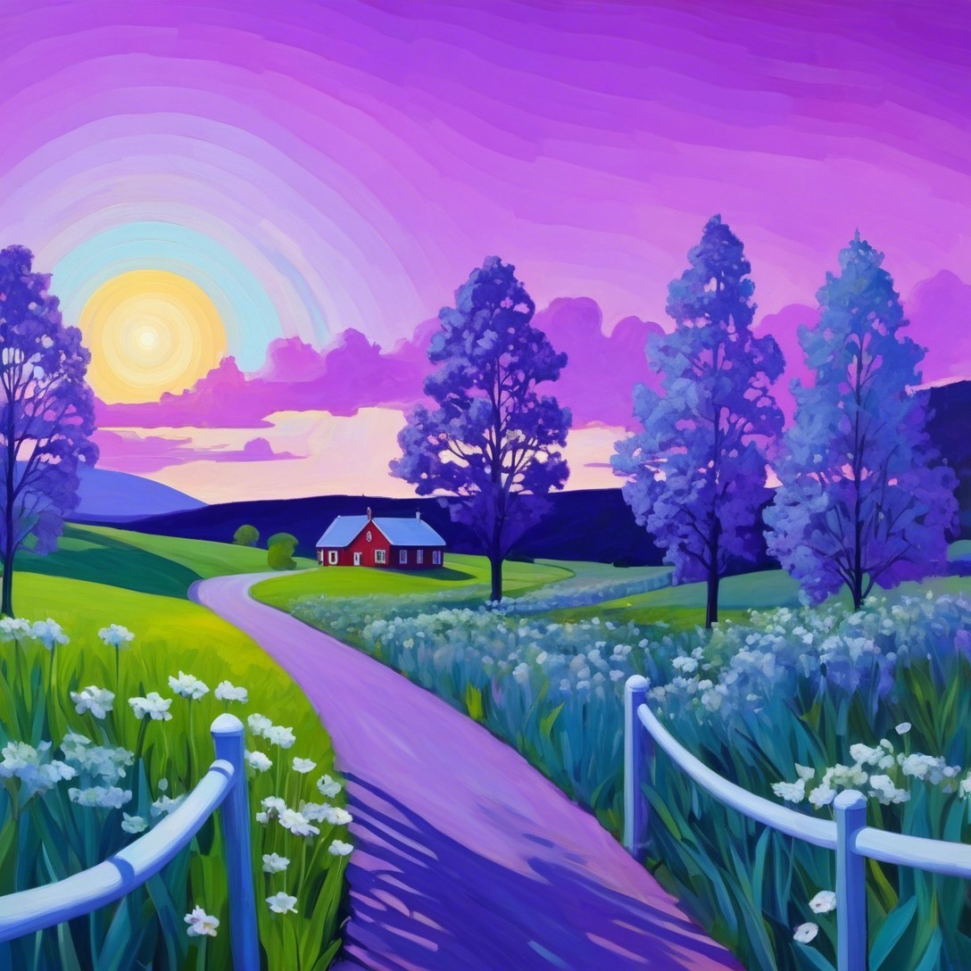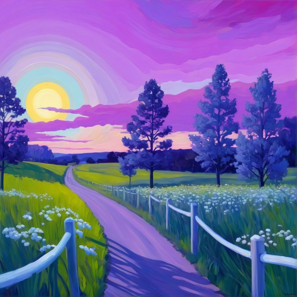 A vibrant landscape features a winding path lined with white fences. Lush green fields and blooming flowers stretch toward a colorful sunset, with tall trees silhouetted against the sky.