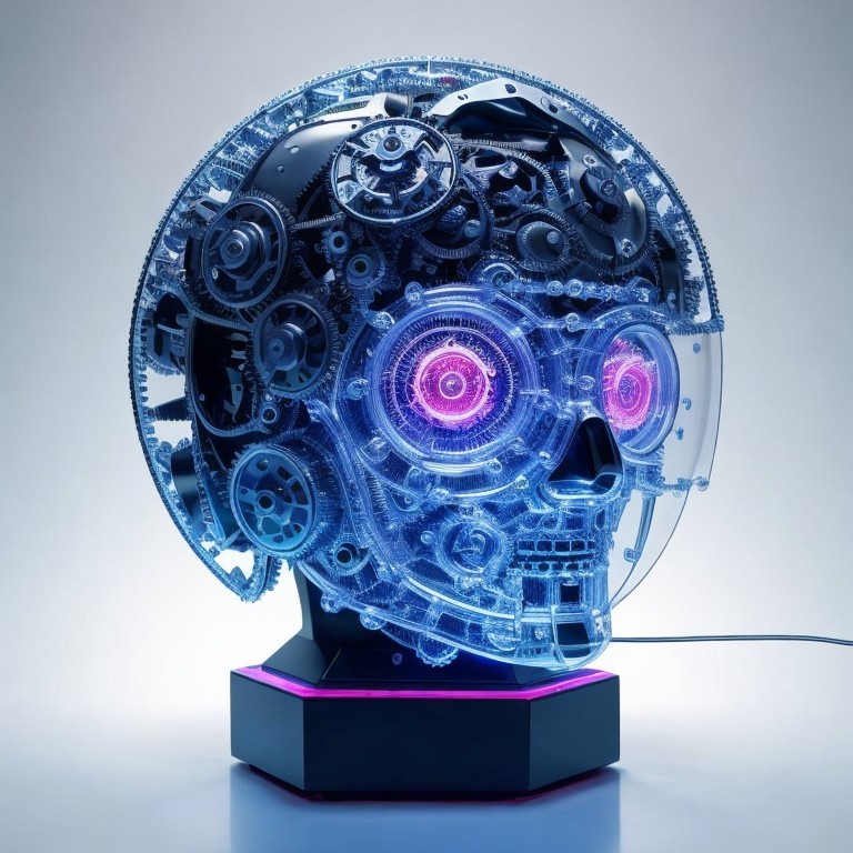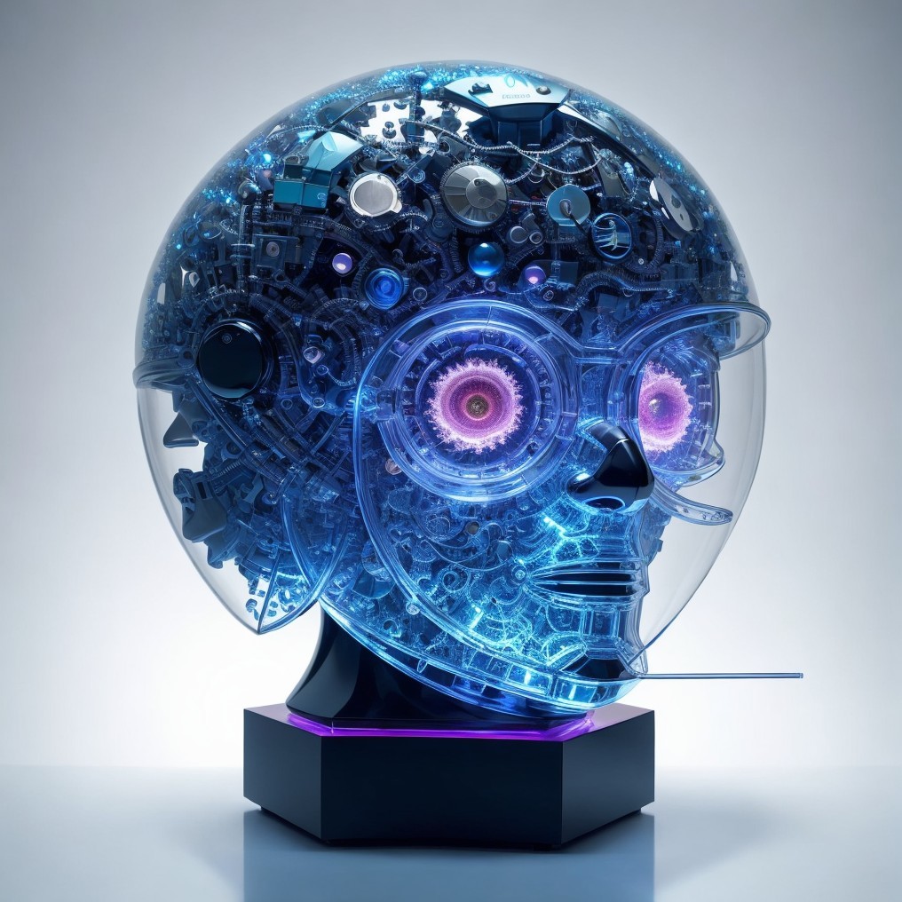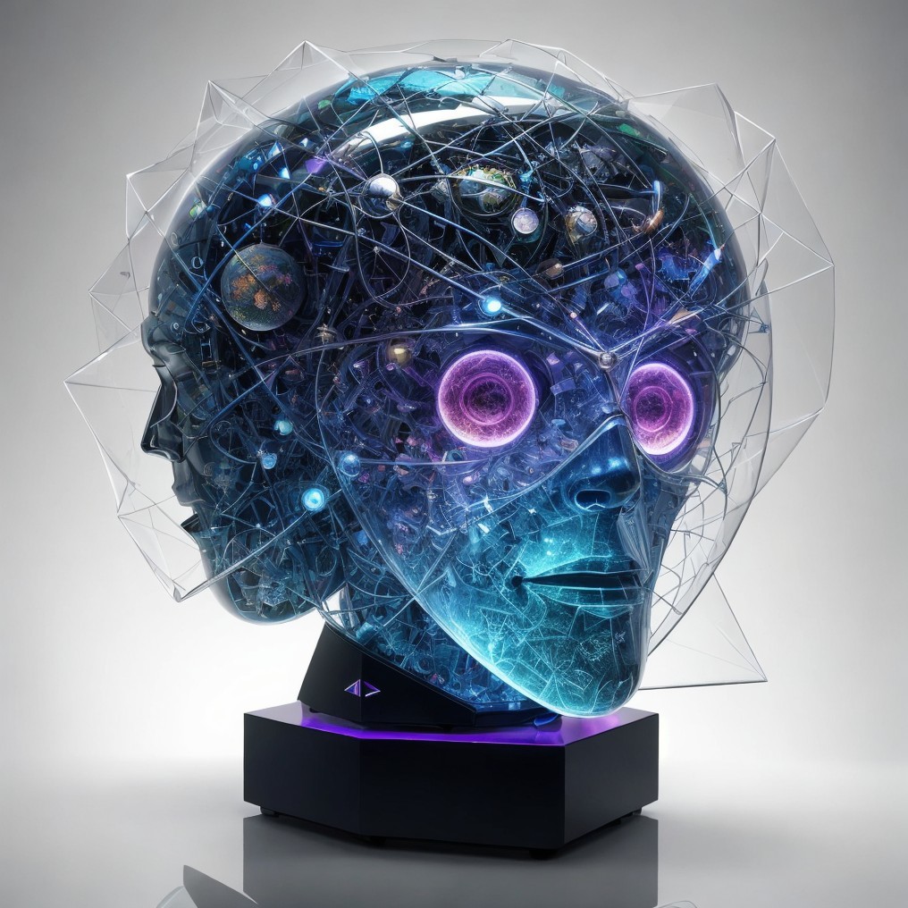 Prompt: "numbers, letters and quantum mathematical equations and symbols are exploding from a robotic head made of glass, which contains cogs and wheels like a mechanical watch"