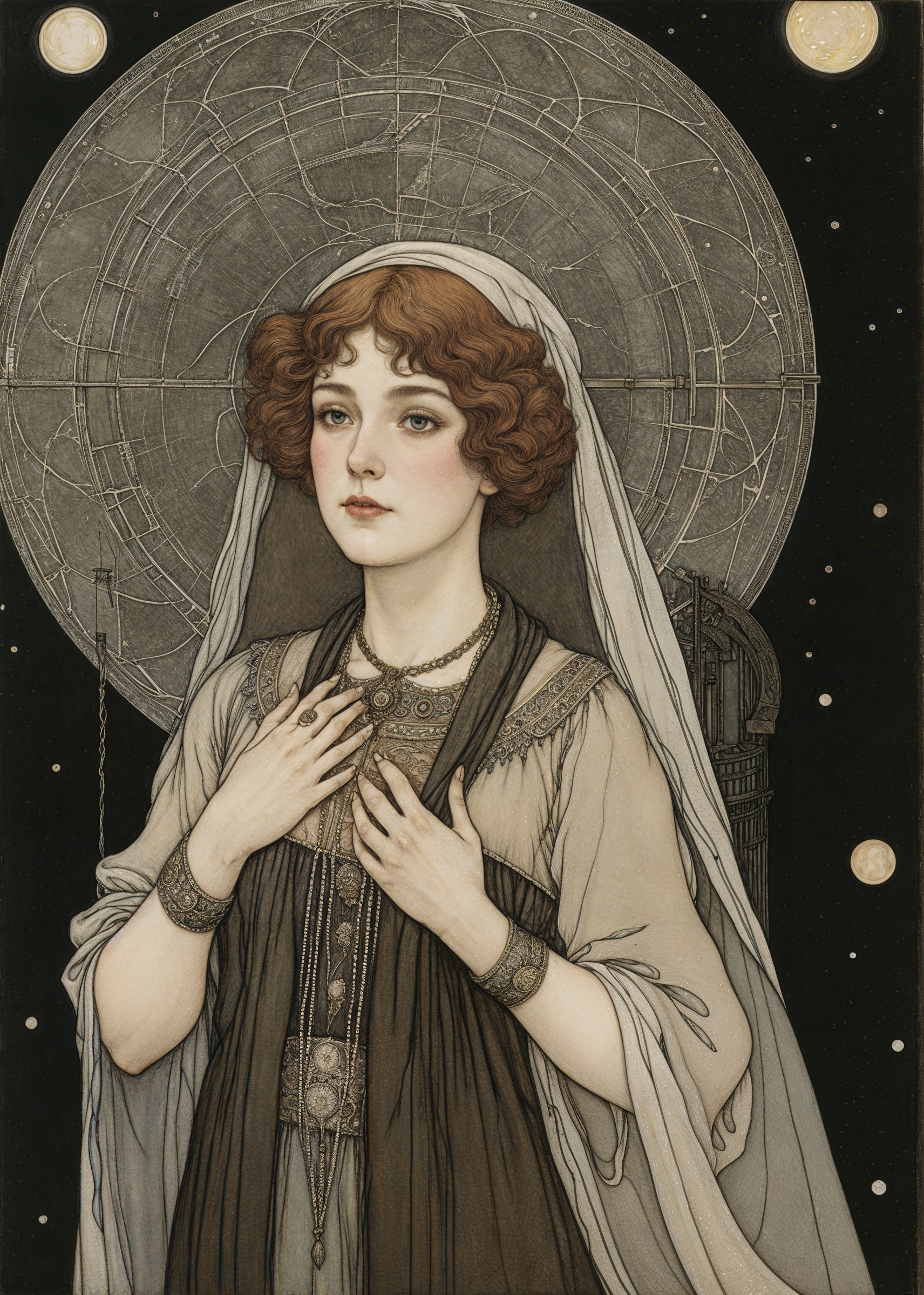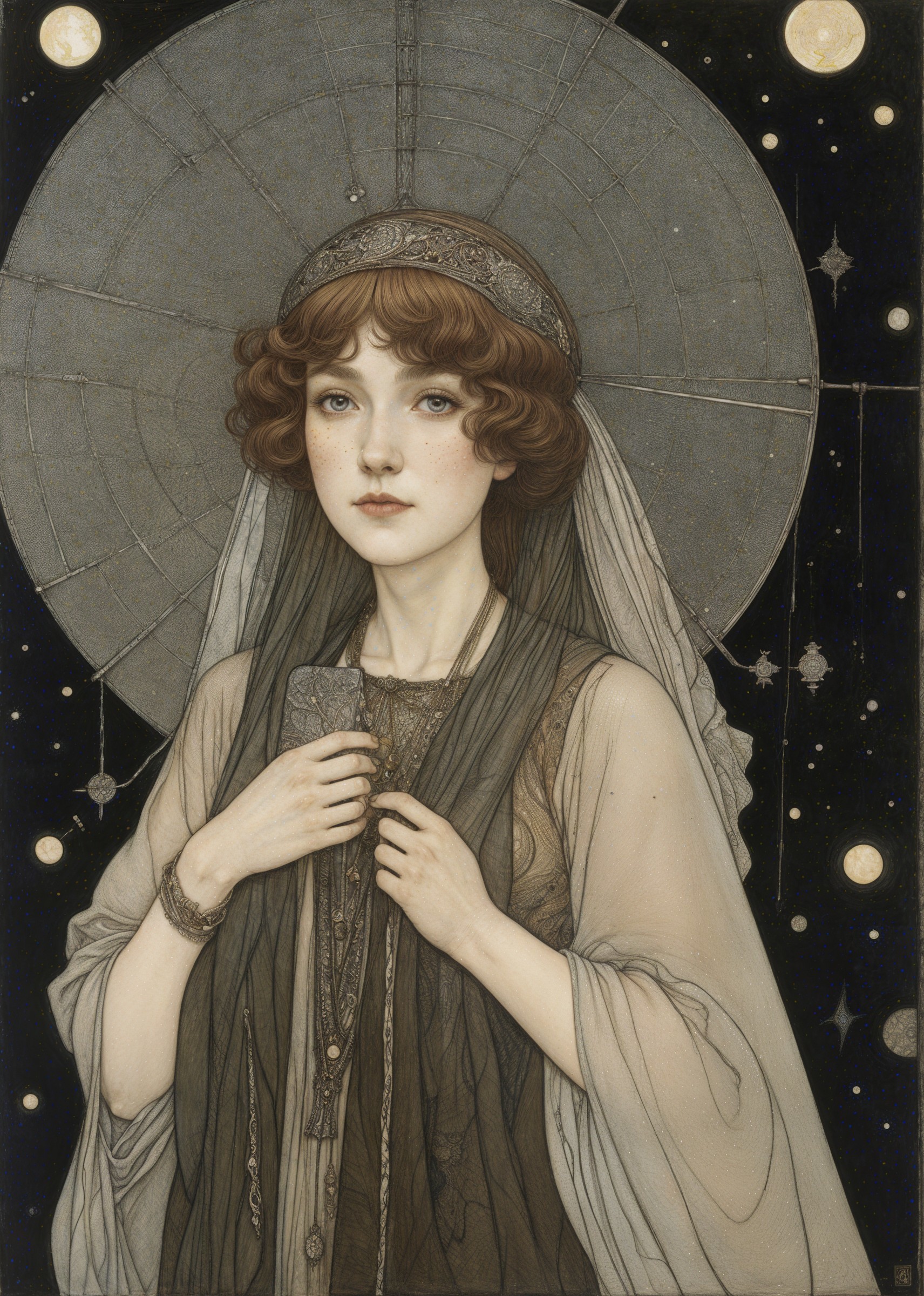 A portrait of a woman with flowing hair, adorned in intricate attire and a decorative headpiece. She gazes thoughtfully to the side, exuding elegance and mystique.