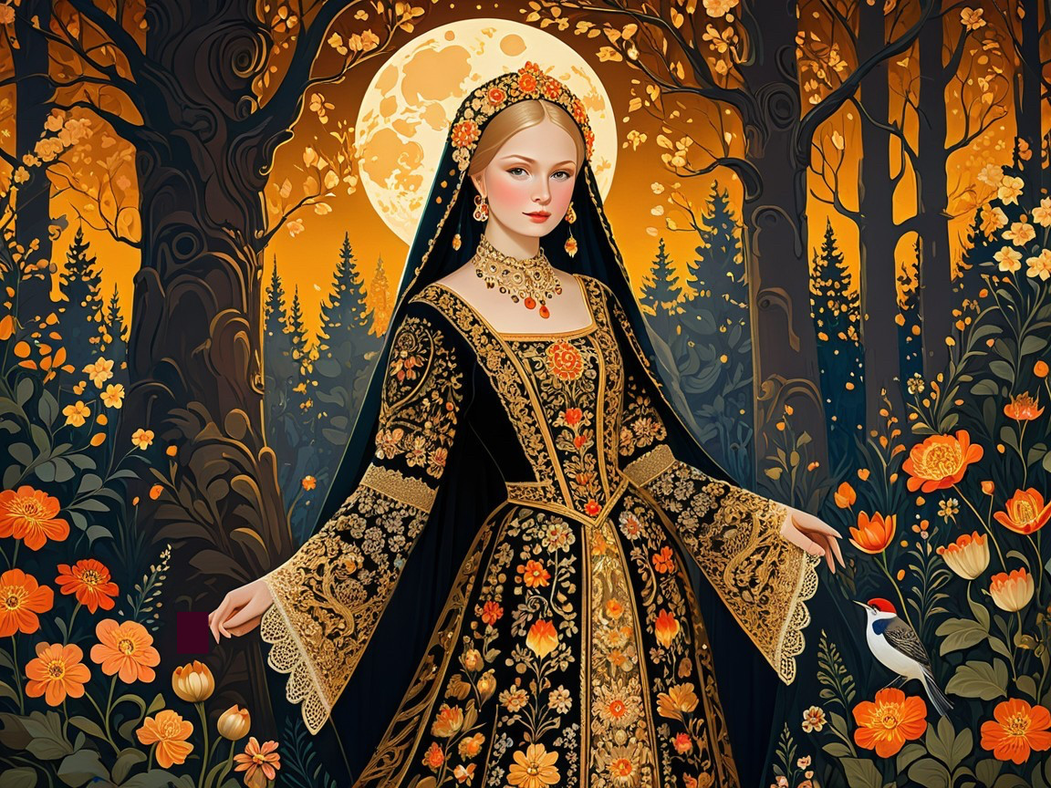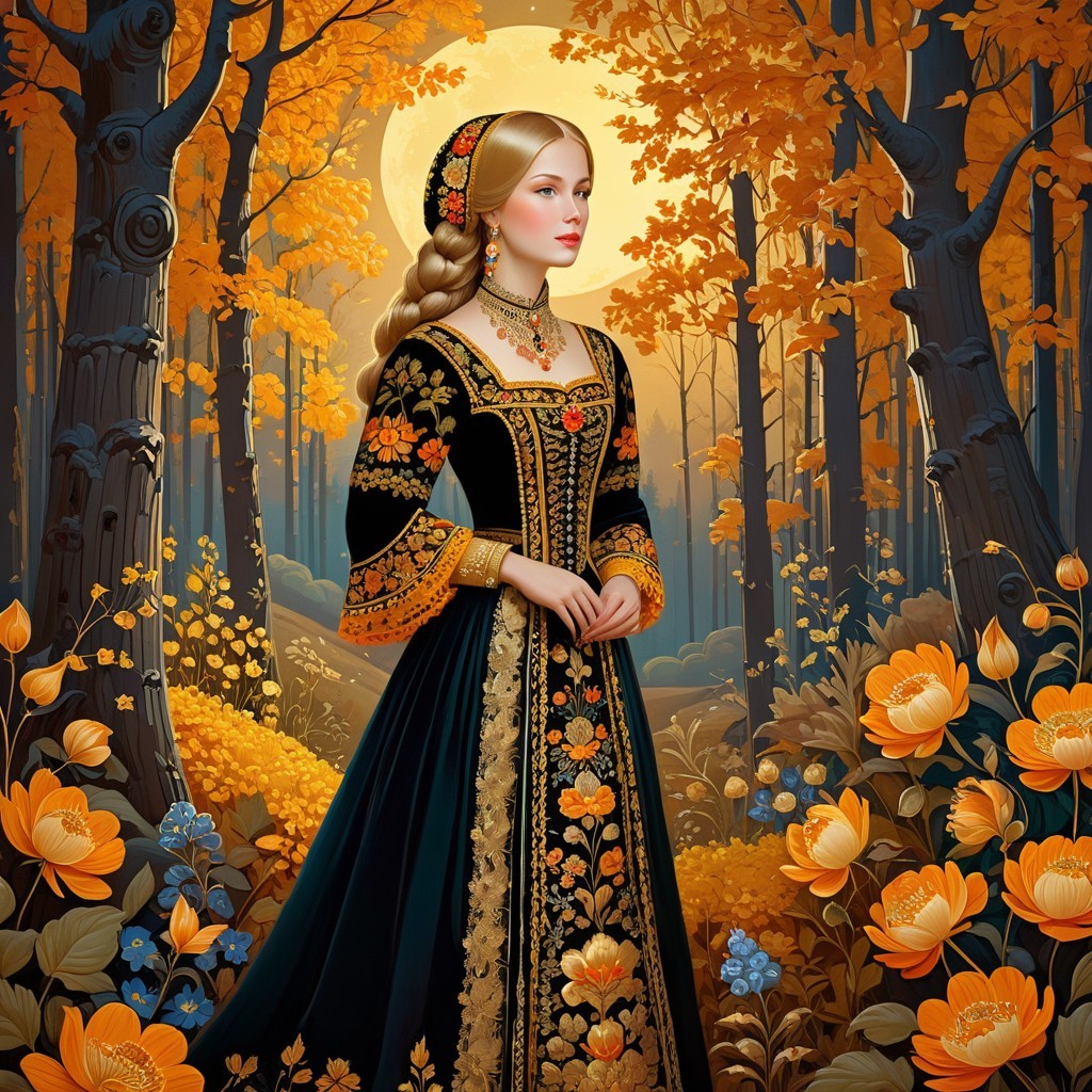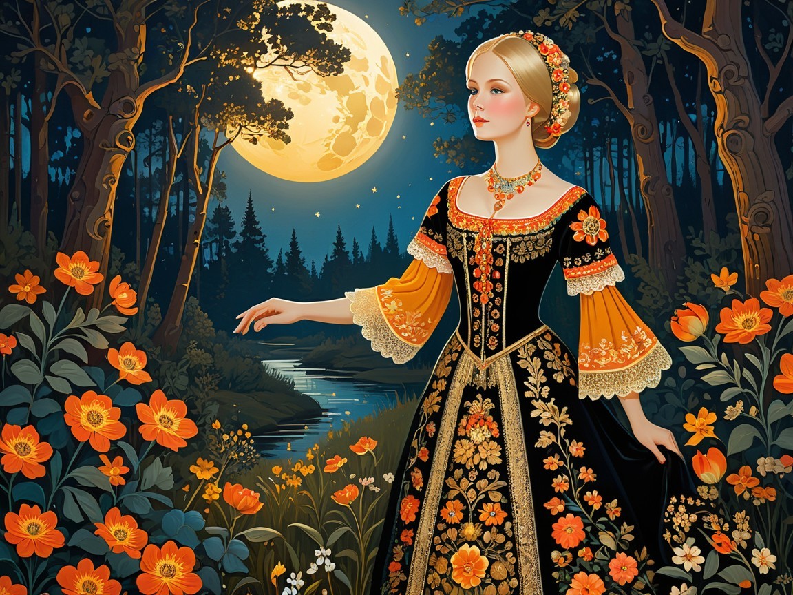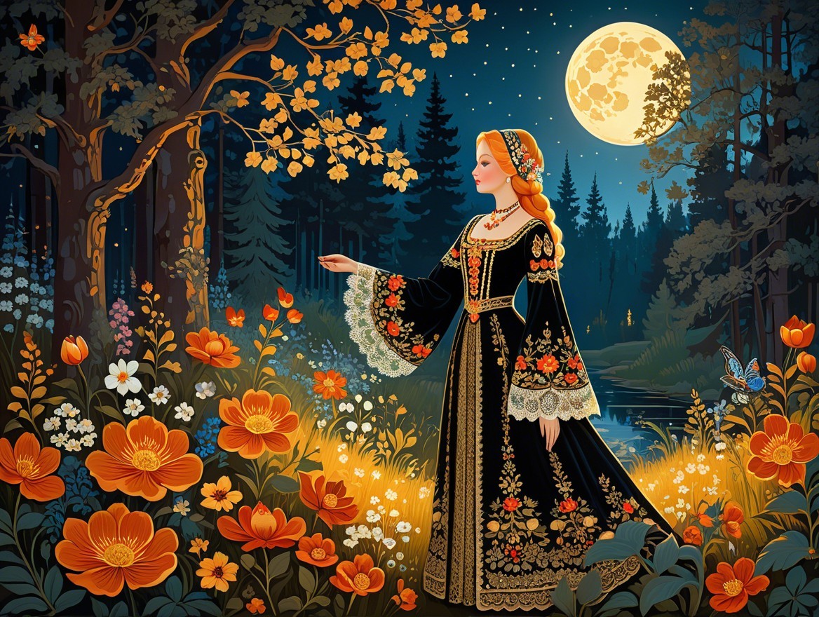 Forest, moonlit night, a woman in a Russian folk costume stands in the forest among beautiful flowers.Flowers in the style of Khokhloma painting.Palekh.Gold filigree.Tree.Amber.Gold.Warm light.Russian patterns. Gorodetsky painting.Vologda lace.An amazing illustration of a fairy tale.The style of Ivan Bilibin, Vladimir Suteev, Elena Polenova.