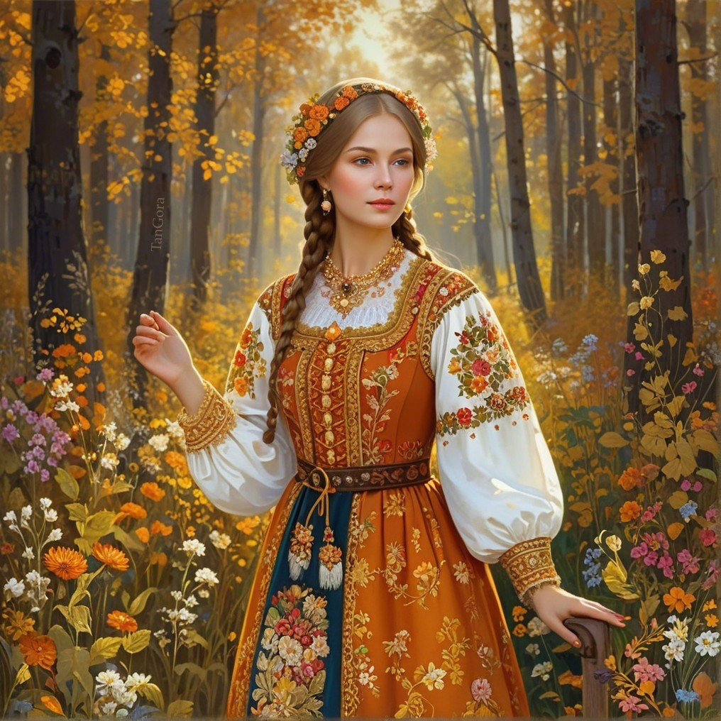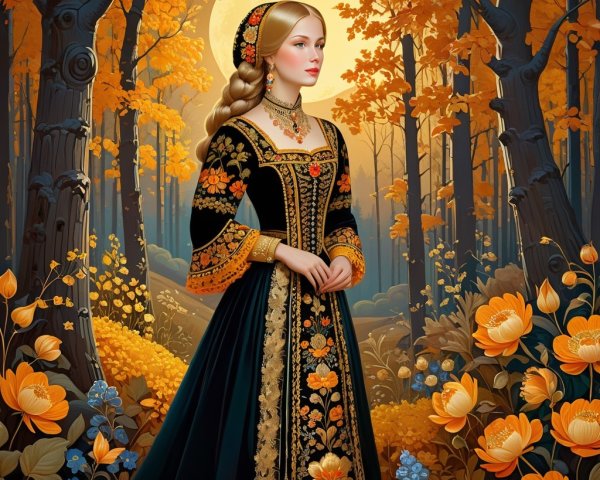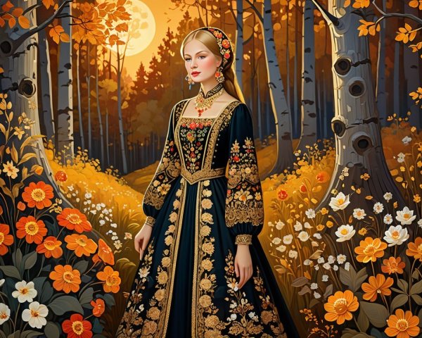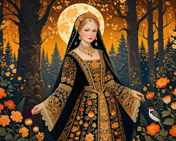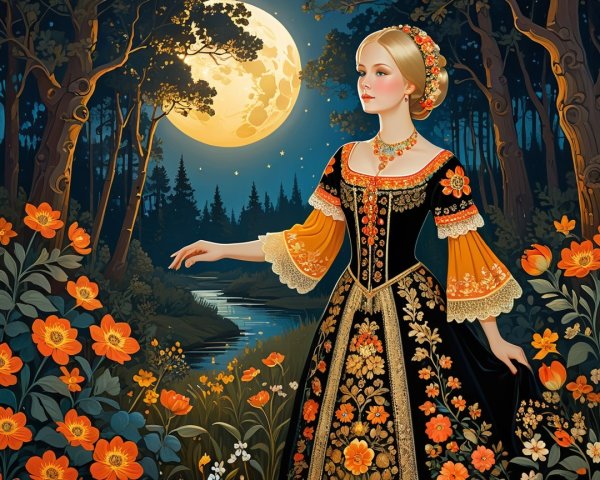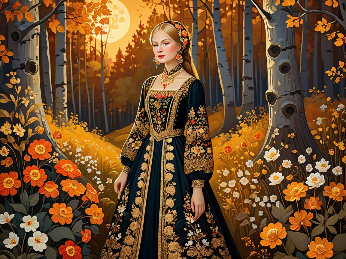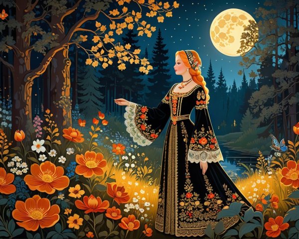 Forest, moonlit night, a woman in a Russian folk costume stands in the forest among beautiful flowers.Flowers in the style of Khokhloma painting.Palekh.Gold filigree.Tree.Amber.Gold.Warm light.Russian patterns. Gorodetsky painting.Vologda lace.An amazing illustration of a fairy tale.The style of Ivan Bilibin, Vladimir Suteev, Elena Polenova.