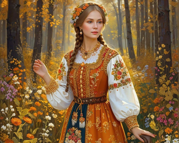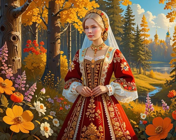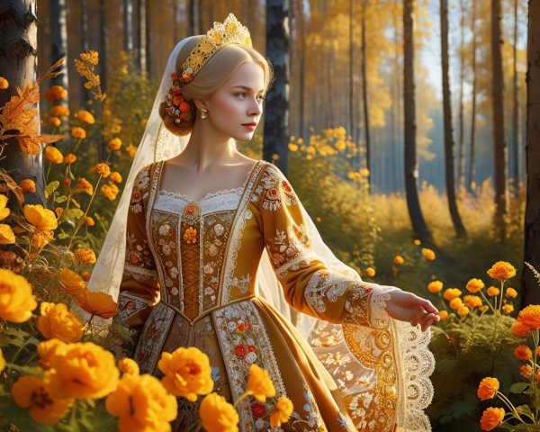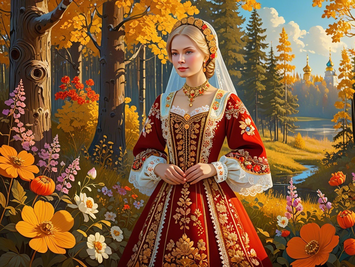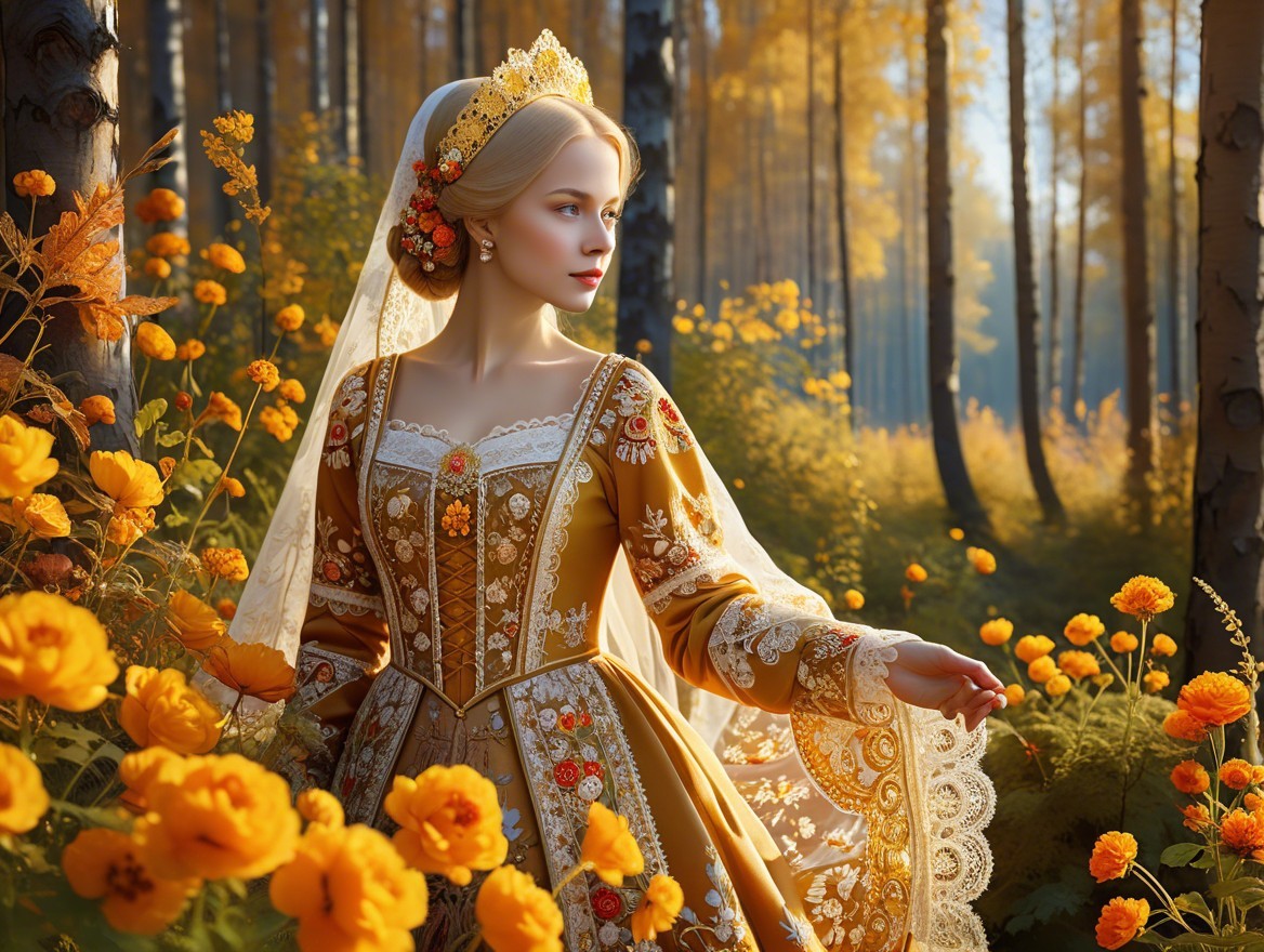 Prompt: Forest, moonlit night, a woman in a Russian folk costume stands in the forest among beautiful flowers.Flowers in the style of Khokhloma painting.Palekh.Gold filigree.Tree.Amber.Gold.Warm light.Russian patterns. Gorodetsky painting.Vologda lace.An amazing illustration of a fairy tale.The style of Ivan Bilibin, Vladimir Suteev, Elena Polenova.