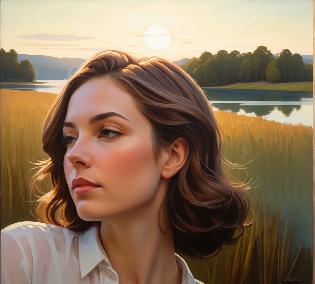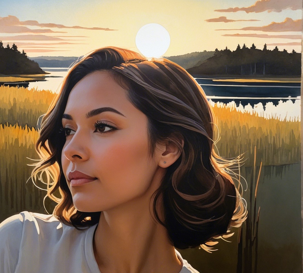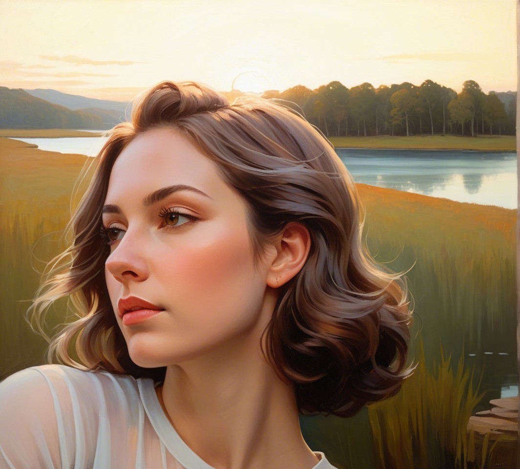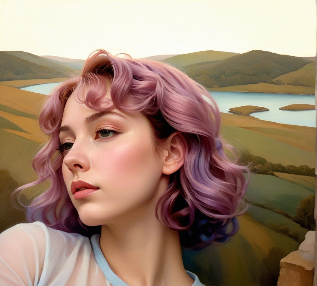 Prompt: Stylized gouache painting by noma bliss, istylized headshot, back-lit, renaissance painting reference, stylized Portraiture with stacked-up perspective by Ivan Rabuzin, Gian Lorenzo Bernini, Enoch Bolles, watercolor and ink, colorful portrait in landscape, created in patchwork style, hues by Aubrey Bear, reminiscent of classic comic book art, smooth, post-impressionist impasto, background: acrylic, thick layers of colored textured paint, tranquil lake, three-point lighting, reflections on water, misty sunrise, pen and ink in warm tones, wavery, contouring bold strokes, plasticity effect, detailed, dramatic lighting, pen and ink, style of Overton Loyd, dreamy, serene, warm color palette, luminism, intricate details, calm water, blotting paint with thick strokes, Softened rounded edges, dreamy enchantress with curly hair and blurred aura, wsrm diffused lighting, misty, delicate shades of lavender and pale green, pastel tones of blue and sea-green, natural background in acrylic ink, intricate soft pastel color palette,, peaceful countryside setting, soft curves, hatching, tessellated style, flat brush strokes, attractive, vector 9:5, misty background, dramatic lighting casting eerie shadows, dark, ominous atmosphere, reminiscent of Overton Loyd, unique aesthetic, otherworldly, high detail, brushed textures in simplistic style, mysterious storybook illustration art by Overton Loyd, tints of freda people and Susan Seddon Boulet, 1970s advertising art merged with Renaissance portrait, hatching, stacked-up perspective, Beautiful artwork, 3 point light reflections, hues, filigree, fine brush strokes in background, artistic Surrealism of ho baron, watercolor and ink extrusion, golden hour, triadic color scheme pink dark green ochre, squiggly, colored spaces, american gothic 1.7, parallax occlusion 1.2, octane render, rim lighting by William Bradley, subtle coloring 1.9, traumacore 1.2, overall composition by Georgia o'keffee and Tim Burton and ho baron, juvenile