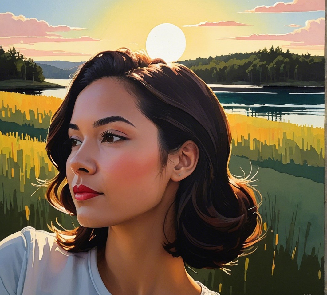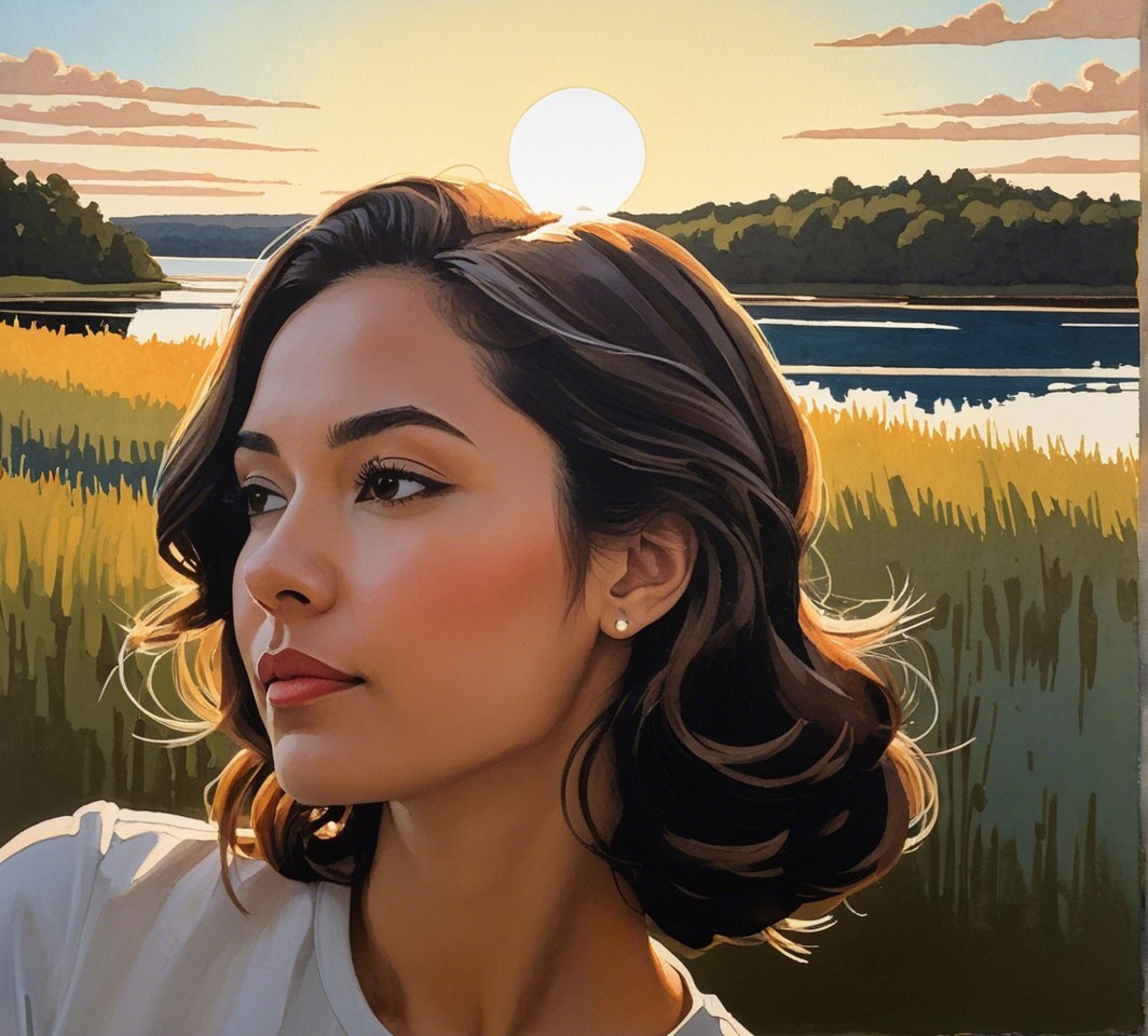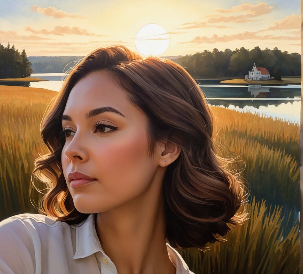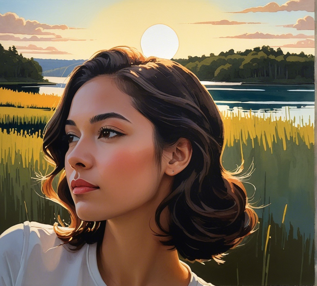 Prompt: Stylized gouache painting by noma bliss, istylized headshot, back-lit, renaissance painting reference, stylized Portraiture with stacked-up perspective by Ivan Rabuzin, Gian Lorenzo Bernini, Enoch Bolles, watercolor and ink, colorful portrait in landscape, created in patchwork style, hues by Aubrey Bear, reminiscent of classic comic book art, smooth, post-impressionist impasto, background: acrylic, thick layers of colored textured paint, tranquil lake, three-point lighting, reflections on water, misty sunrise, pen and ink in warm tones, wavery, contouring bold strokes, plasticity effect, detailed, dramatic lighting, pen and ink, style of Overton Loyd, dreamy, serene, warm color palette, luminism, intricate details, calm water, blotting paint with thick strokes, Softened rounded edges, dreamy enchantress with curly hair and blurred aura, wsrm diffused lighting, misty, delicate shades of lavender and pale green, pastel tones of blue and sea-green, natural background in acrylic ink, intricate soft pastel color palette,, peaceful countryside setting, soft curves, hatching, tessellated style, flat brush strokes, attractive, vector 9:5, misty background, dramatic lighting casting eerie shadows, dark, ominous atmosphere, reminiscent of Overton Loyd, unique aesthetic, otherworldly, high detail, brushed textures in simplistic style, mysterious storybook illustration art by Overton Loyd, tints of freda people and Susan Seddon Boulet, 1970s advertising art merged with Renaissance portrait, hatching, stacked-up perspective, Beautiful artwork, 3 point light reflections, hues, filigree, fine brush strokes in background, artistic Surrealism of ho baron, watercolor and ink extrusion, golden hour, triadic color scheme pink dark green ochre, squiggly, colored spaces, american gothic 1.7, parallax occlusion 1.2, octane render, rim lighting by William Bradley, subtle coloring 1.9, traumacore 1.2, overall composition by Georgia o'keffee and Tim Burton and ho baron, juvenile