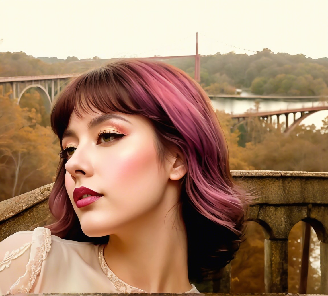 + Prompt:Stylized Portraiture, dramatic lighting, pen and ink, style of Overton Loyd and Tim Burton, dreamy, Surrealism of ho baron, watercolor and ink extrusion, golden hour, upper body portrait in front of a bridge, stippled, hazy, tesselated, sculpted, baroque, triadic color scheme pink dark green ochre, squiggly line-art features, colored spaces, american gothic 1.7, parallax occlusion 1.2, octane render illustration 1.5, rim lighting by William Bradley, subtle coloring 1.9, traumacore 1.2, overall composition by Georgia o'keffee and Tim Burton and ho baron,