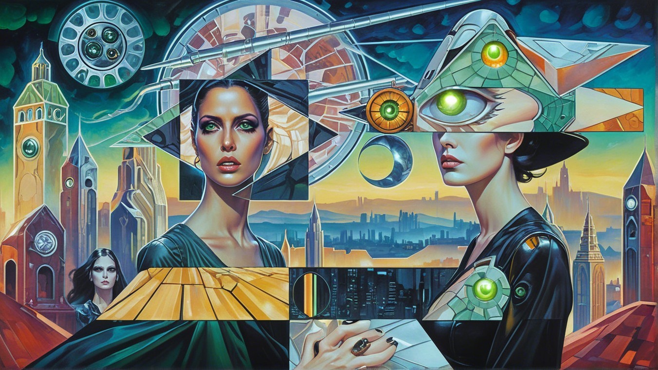 This vibrant sci-fi artwork features two women in striking outfits, standing against a futuristic cityscape. Behind them, an imposing spacecraft and mysterious figures suggest an otherworldly narrative.
