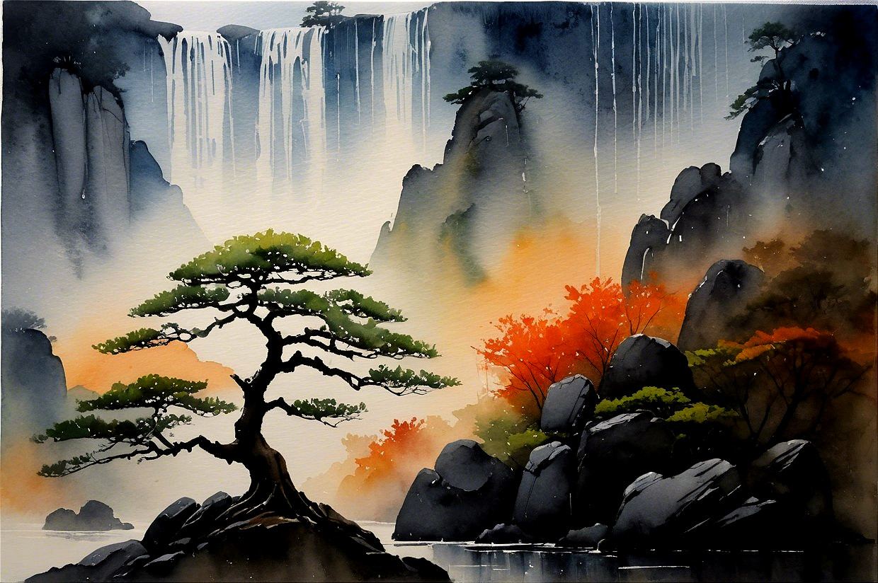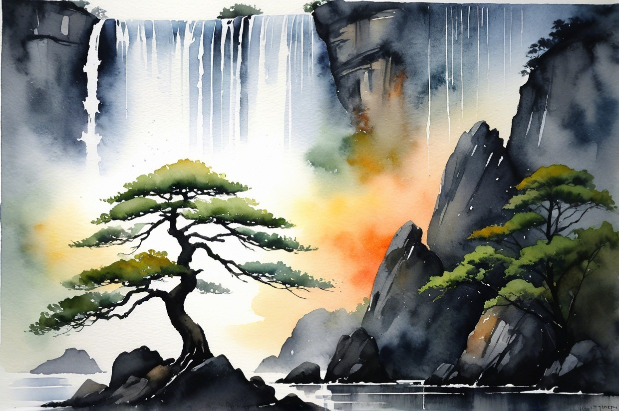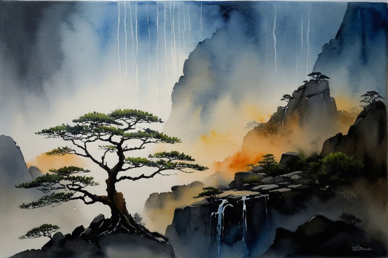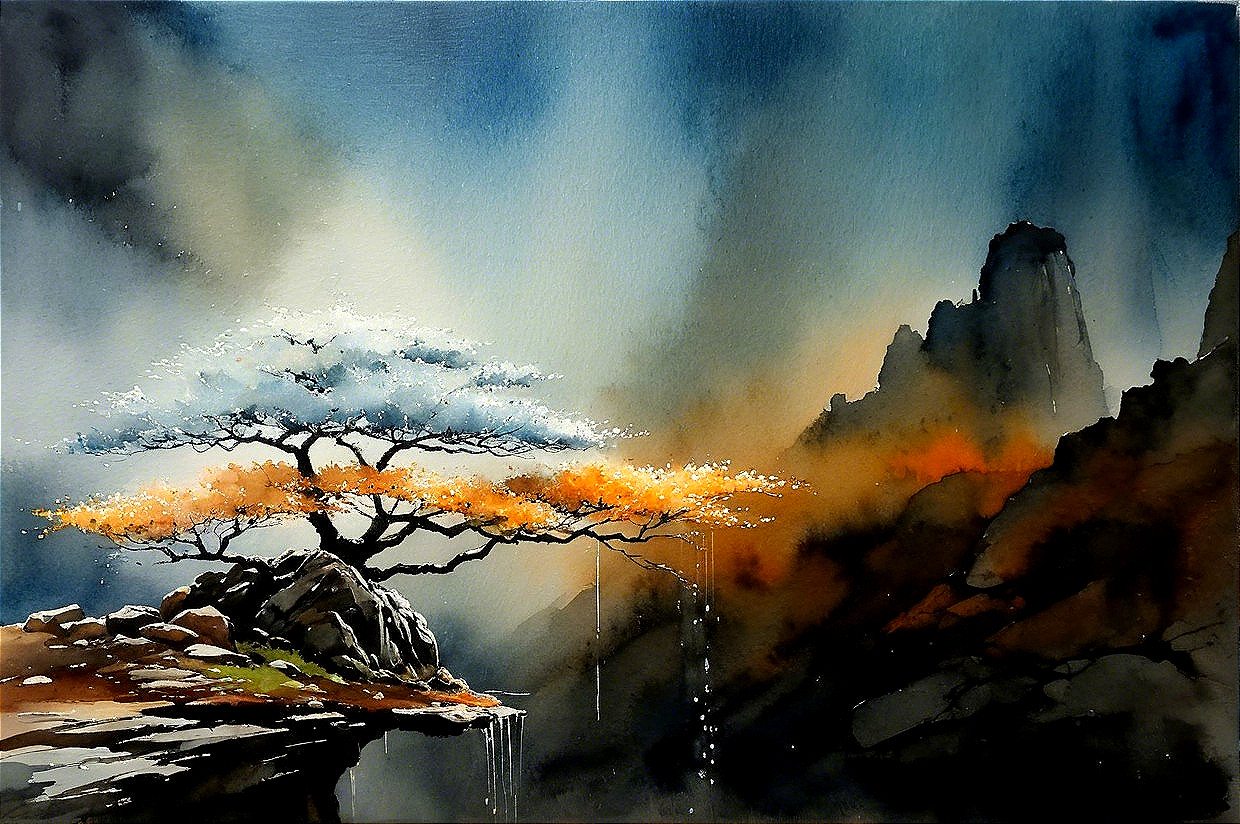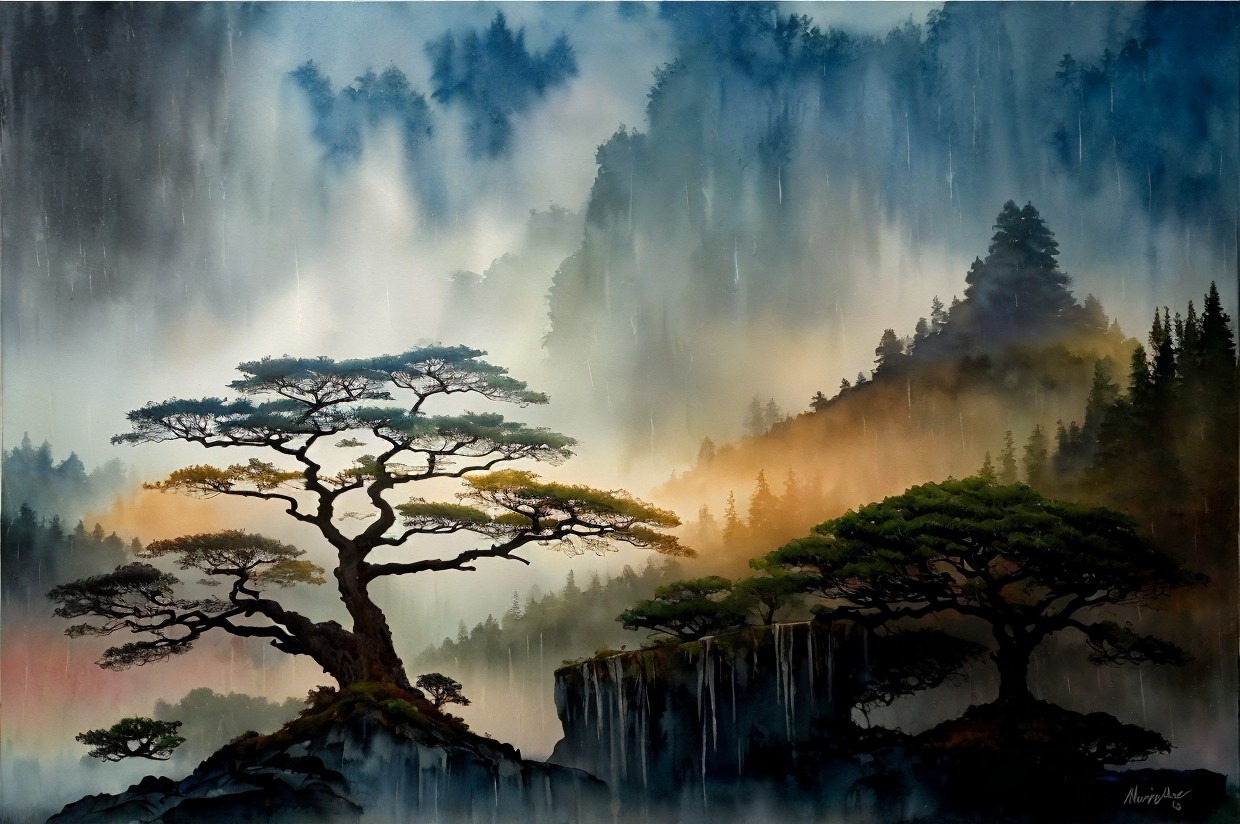 A watercolor painting, wet on wet technique, utilizing minimal paints and maximum loose water effects. It depicts a rainy, misty day, with a rain curtain over the scene. A towering abstract majestic tree, resembling a bonsai tree, with its stem arched on one side and asymmetric branches, has grown on a small rocky island, surrounded by a blue-grey water. The tree has