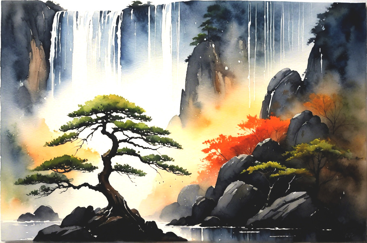 A watercolour painting, wet on wet technique, utilizing minimal paints and maximum loose water effects, vibrant colours. It depicts a rainy, misty day, with a rain curtain over the scene. A towering, big abstract majestic tree in the foreground, resembling a bonsai tree, with its stem arched on one side and asymmetric branches, has grown on a small rocky island, surrounded by blue-grey water, 2 birds are flying around. The tree has asymmetrical branches, each in a distinct color: soft yellow, green, soft amber, dark red, and soft grey. The image of the tree is reflected in the water, where the drops of rain form circles. A misty background with weak bokeh lights that highlights the beauty of the tree. Artistic interpretation, 3D, Zen feeling