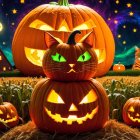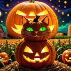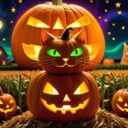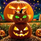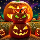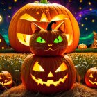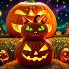 A Halloween scene featuring glowing jack-o'-lanterns stacked like a cat, with a playful black cat on top. A moonlit sky and twinkling stars complete the festive atmosphere.