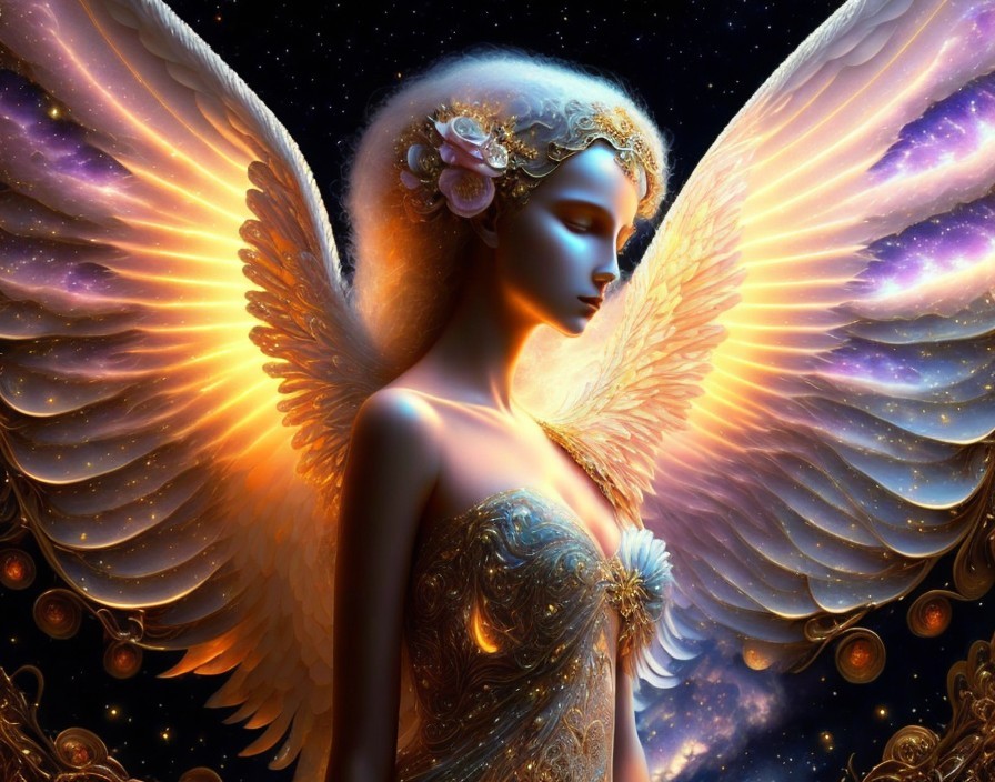 An angelic figure with glowing wings and ornate attire against a cosmic backdrop.