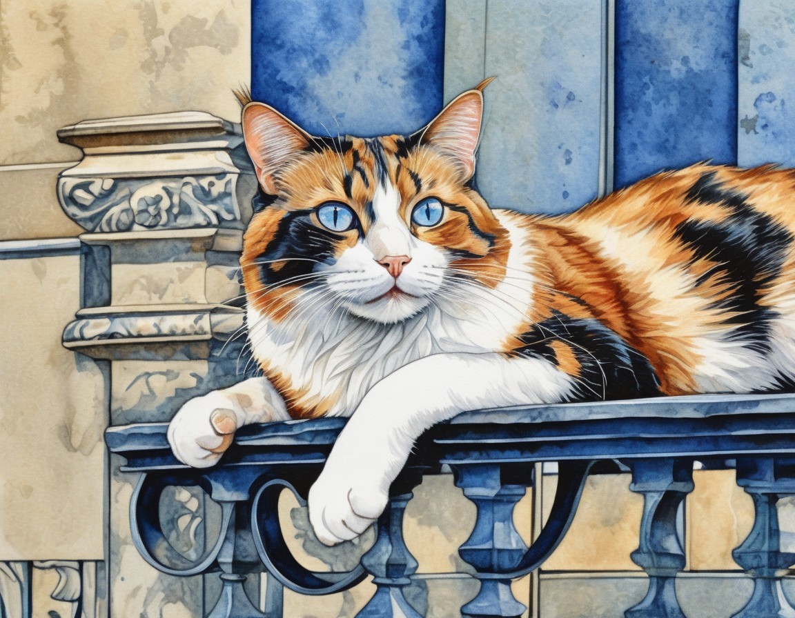 A calico cat with striking blue eyes resting on a balcony, with detailed architectural elements in the background.