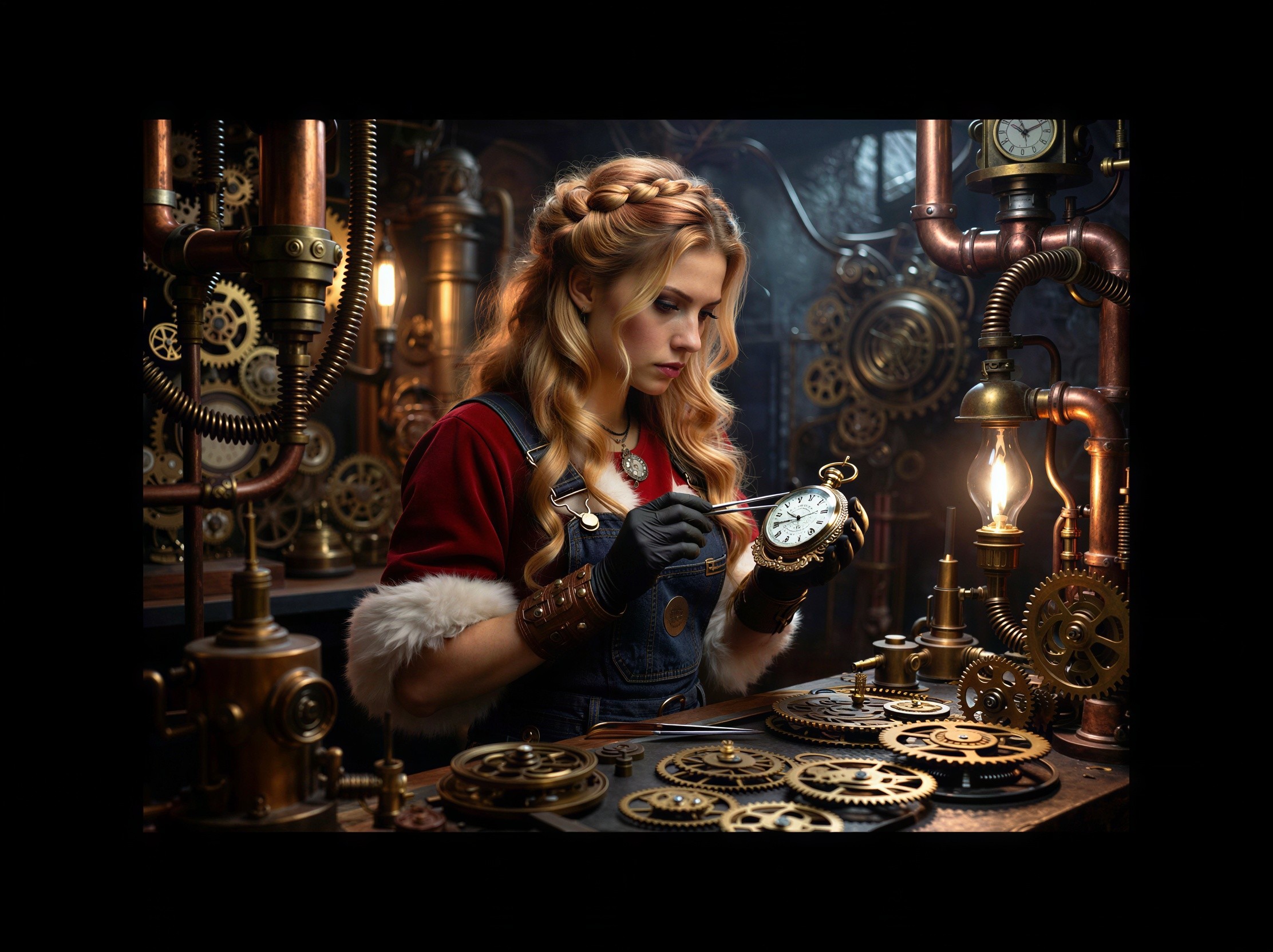 A detailed long shot of a beautiful young blonde woman wearing a red fuzzy top with overalls, gold wrist bands, and black gloves, holding a steampunk pocket watch, with an assortment of cogs and gears on the table in front of her, and steampunk machinery, pipes, and lanterns in the background.