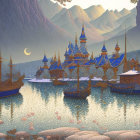 Three majestic ships navigate turbulent waters, their sails billowing against a dramatic sky. Waves crash onto the shore, illuminated by moonlight piercing through the clouds.