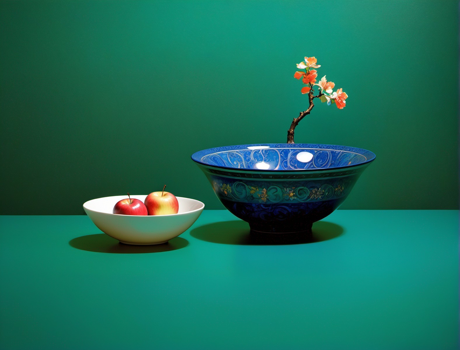A still life photo featuring a bowl of oranges and a plate with apples on a green surface with a matching backdrop.