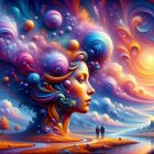 A vibrant, surreal landscape features a giant, serene face formed by swirling clouds and colors, with a sunset reflecting on a river. Two figures walk hand in hand towards the glowing horizon.