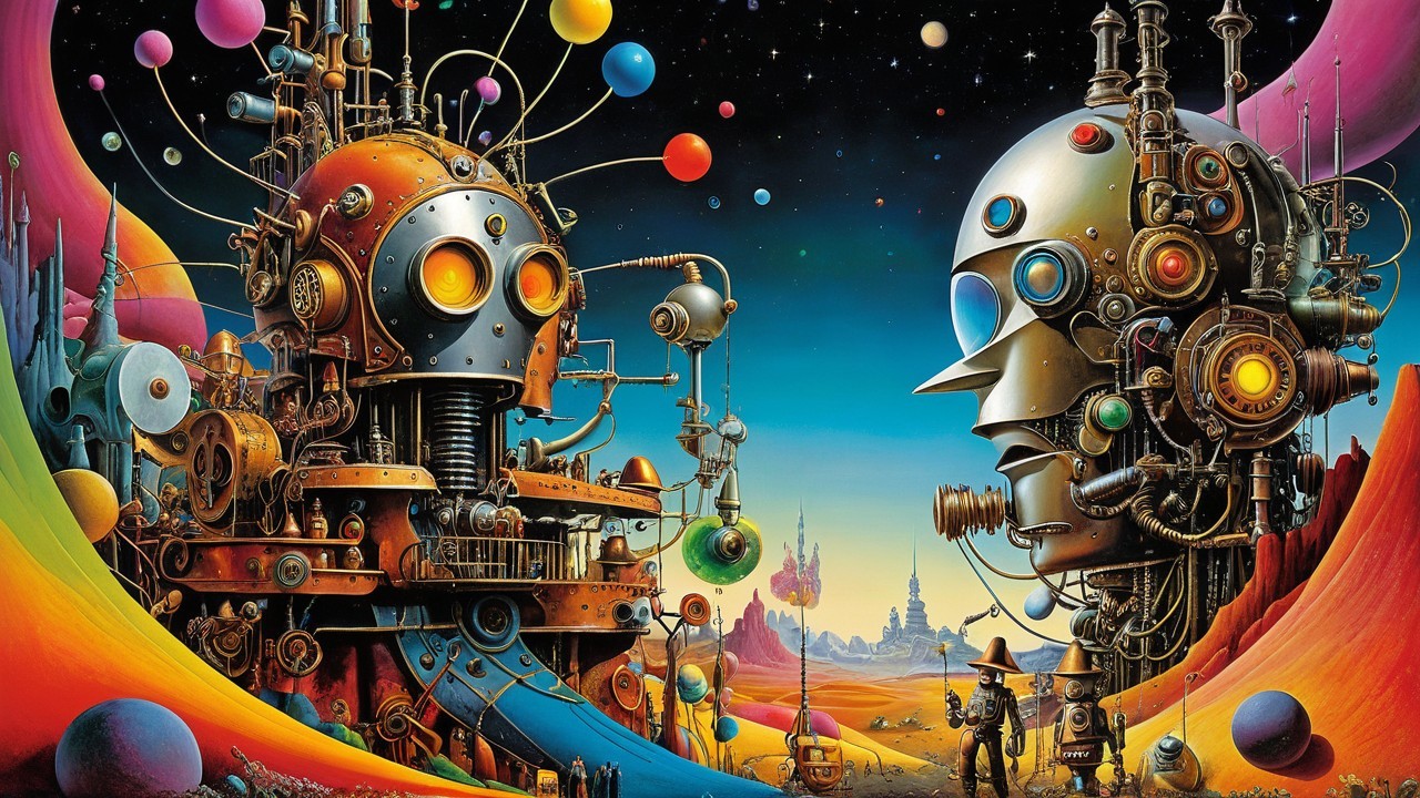 Prompt: Very intricate, colorful and astonishingly beautiful psychedelic bio-robotic animalistic steampunk mechanisms communicating and playing with a dazed psychedelic explorer in otherworldly setting. Some of them looking as if designed by Miro, some by Yves Tanguy, others by Tim Burton, some by Roberto Matta and Enki Bilal.