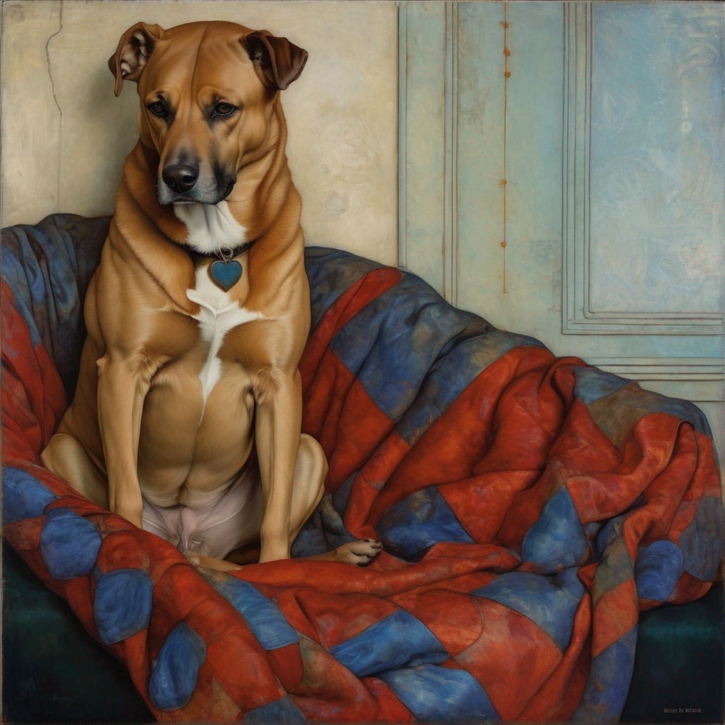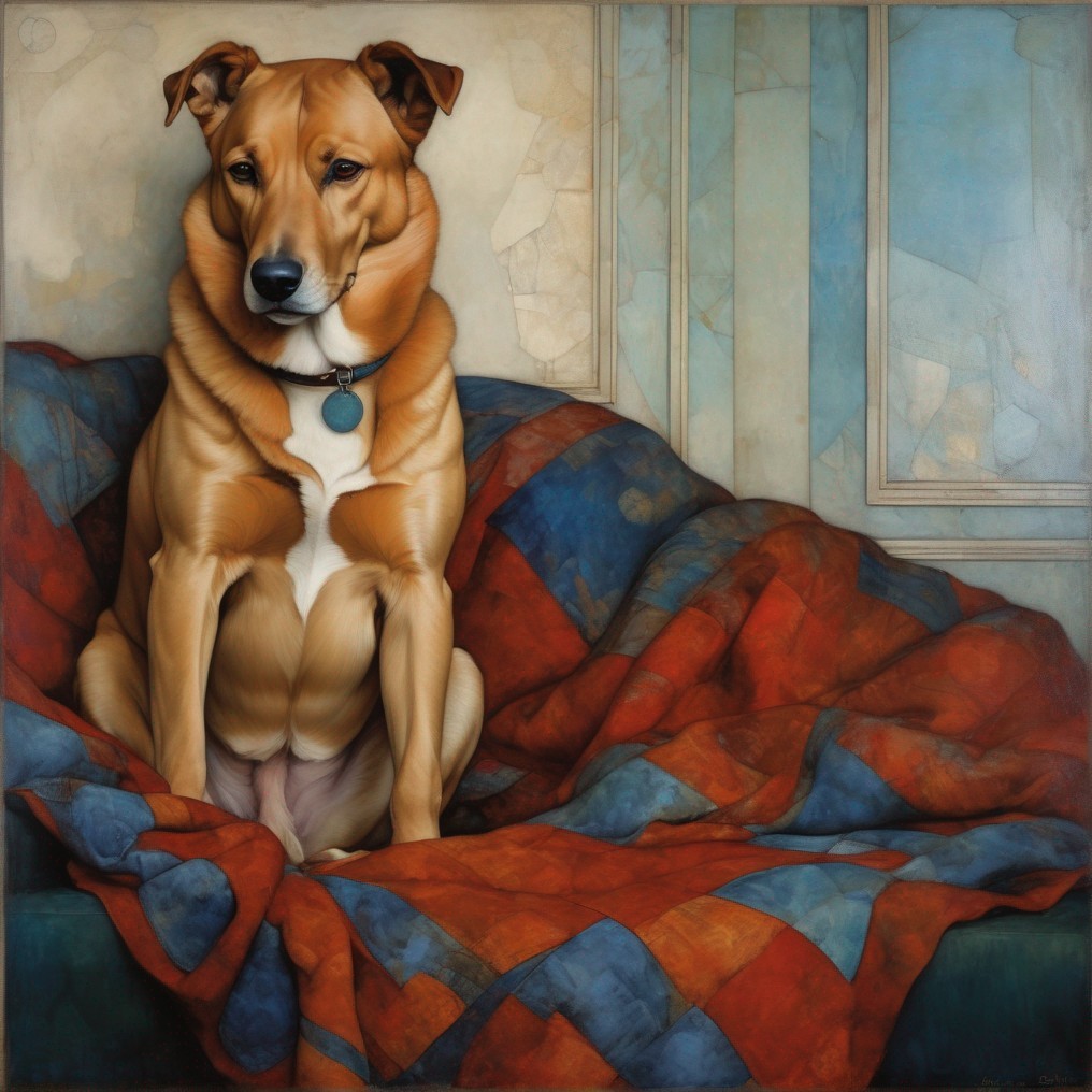 Realistic Brown Dog Painting on Colorful Quilt and Textured Blue Wall