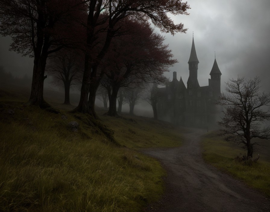 A moody, gothic landscape with a castle atop a hill, framed by crimson trees under a brooding sky.