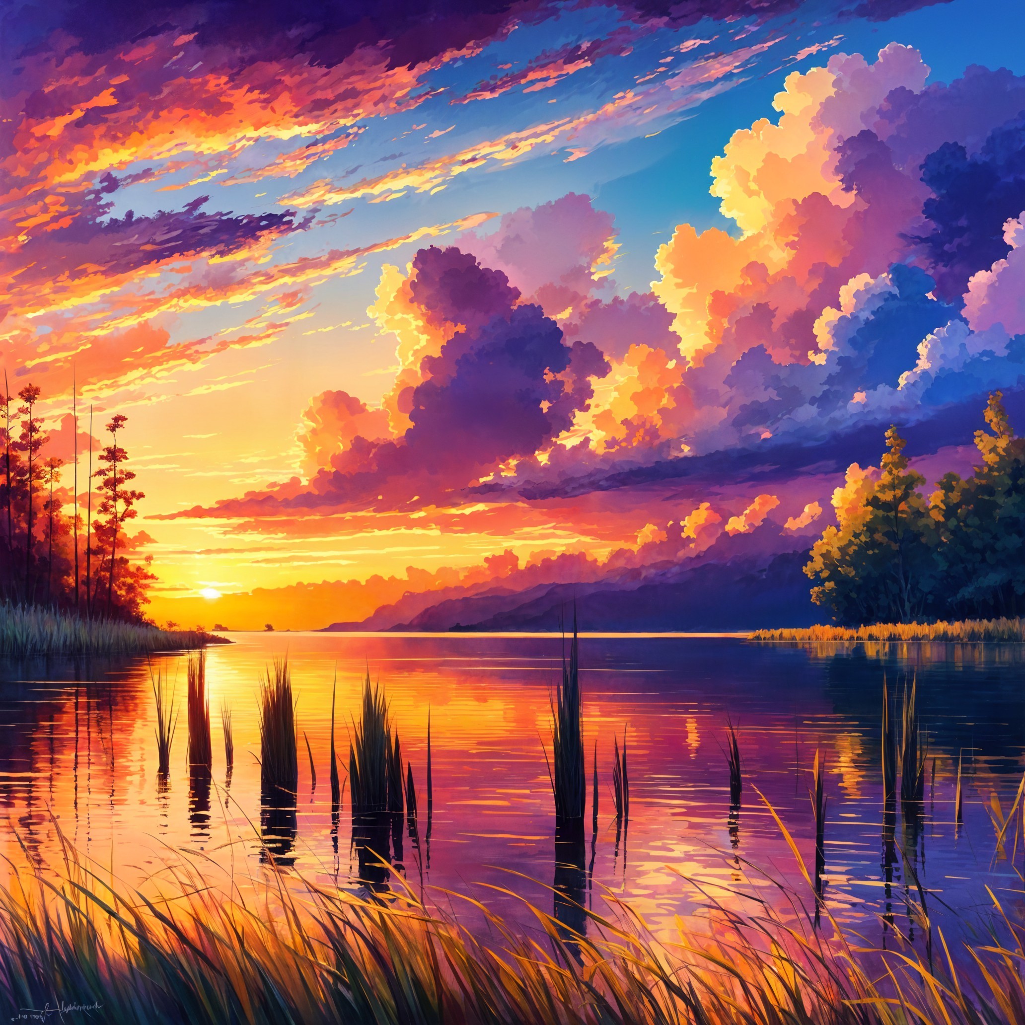 A vibrant sunset paints the sky with shades of orange, pink, and blue, reflecting on a calm lake. Silhouetted grasses line the shoreline, framed by distant trees and fluffy clouds.