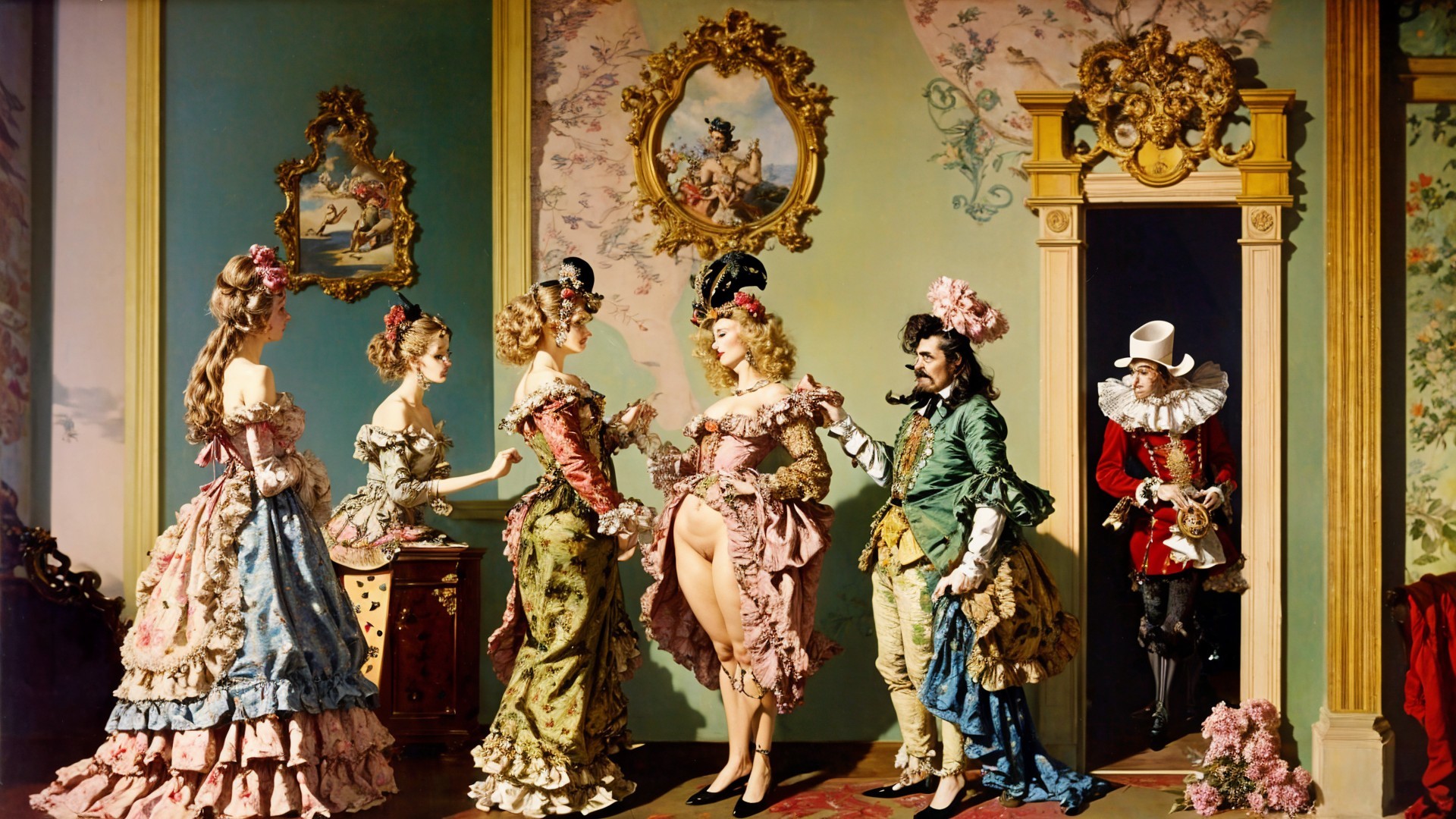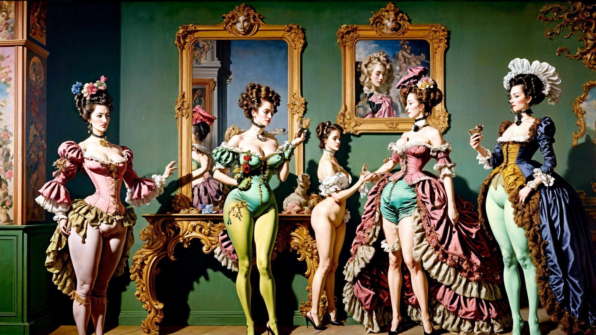 A lavish scene featuring five women in opulent, historical gowns, each in varying pastel and jewel tones. They stand in a grand room adorned with elaborate mirrors and ornate decor.