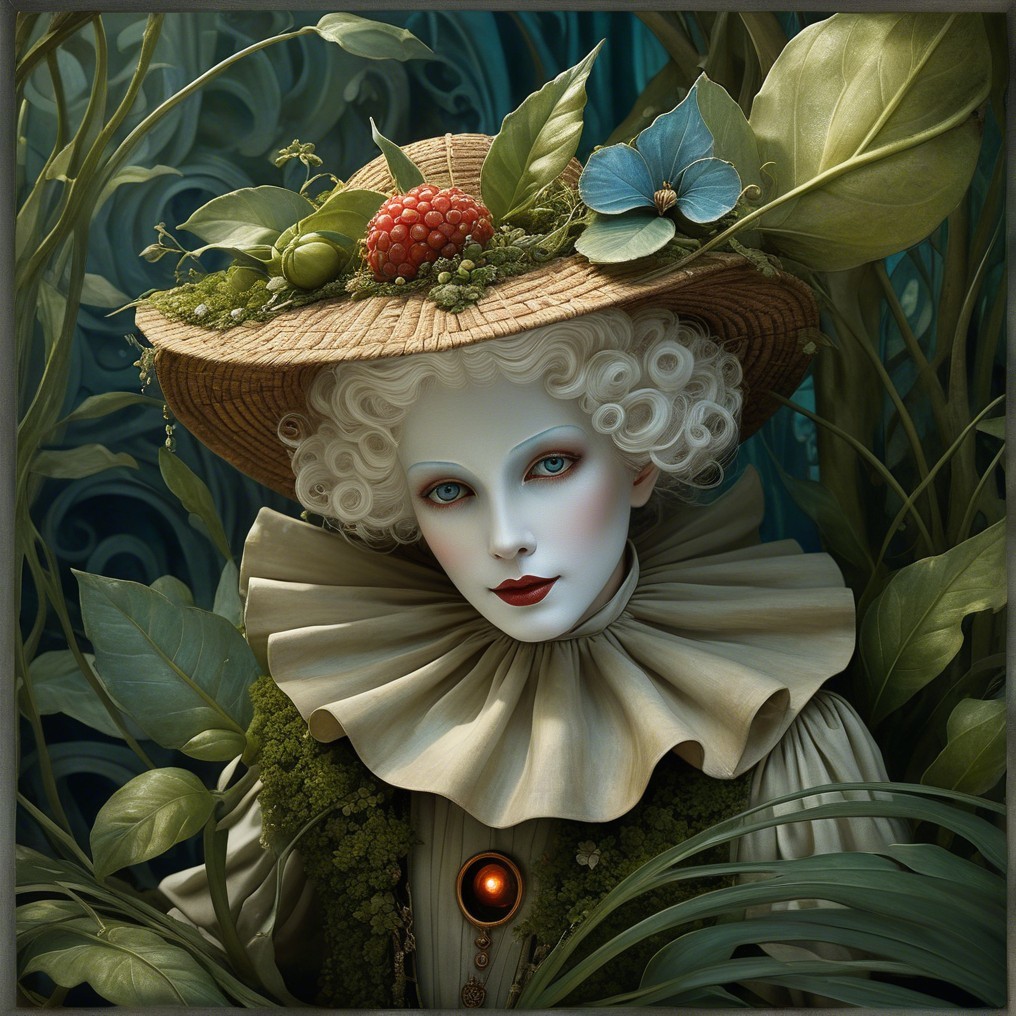 Close up, impish mischievous gorgeous white face creature with a staring into a portal in a luscious maze, in the style of Alexander Jansson. by Catrin Welz-Stein, Michael Parkes. By Rob Gonsalves, Markus Pierson. Bronze tones.