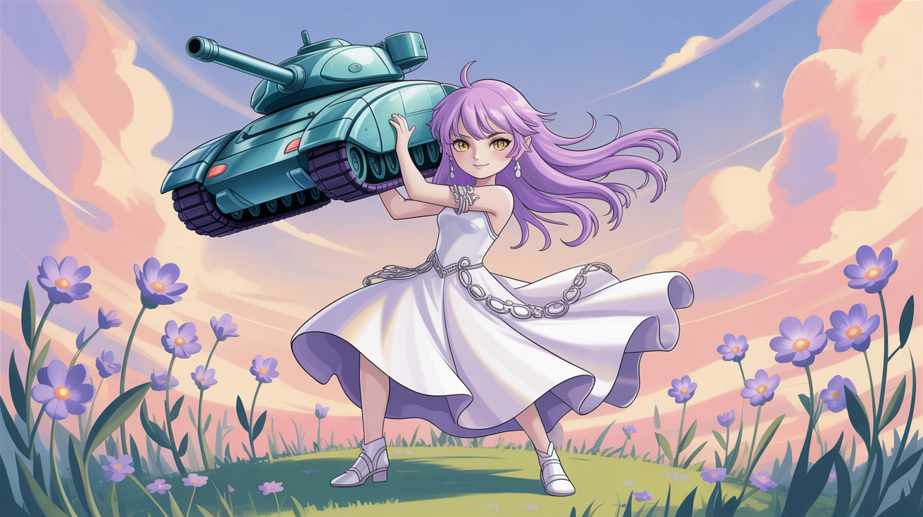 A charming anime goddess effortlessly lifts a tank, showcasing her strength and grace. Her vibrant attire and radiant aura contrast with the heavy machinery, creating a captivating scene.