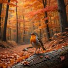 A small bird with an orange chest perches on a mossy log amidst a forest dressed in autumn colors. Vibrant orange and yellow leaves blanket the ground, creating a serene, picturesque scene.