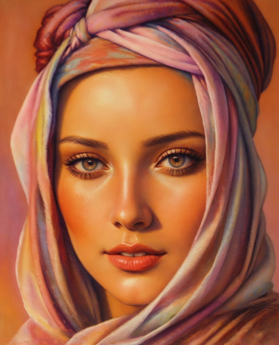 Female with headscarf, Mystical, aquarelle style, headshot, detailed brushed textures, blurry, abstract style, style of Alberto Seveso, Camilla D'Errico, Brad Kunkle, Michael Cheval, deja Thoris, Charles Thomas Burt, Josan Gonzalez, Rob Gonsalves, Margaret Keane, harrison fisher, William Turner, Gustav Klimt, Maxfield Parrish, Tamara de Lempicka, translucent impasto, pastel hues, divisionism, 1970s advertisement style, cubistic, hot, hues, tetradic color scheme beige red auburn orange, delicate soft sunlight from top, dreamscape, medieval, hues, 3d effects 1.8, ambient occlusion 1.5, anisotropic filtering 1.2, subsurface scattering 1.2, stacked-up perspective, raytraced shadows 1.8, retrofuturistic, streamline_moderne, traumacore 1.9, concept art reminiscent of comic book art, tiny flares, juvenile, synthetic, crisp quality, uhd, hdr, octane render illustration 1.5, subtle coloring, plasticity 1.3, complexion 1.4 enlightened, moody, uhd,hdr,