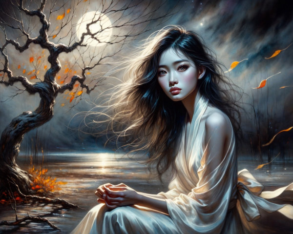 A woman with deep red hair and striking blue eyes surrounded by vibrant red roses at sunset.