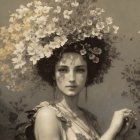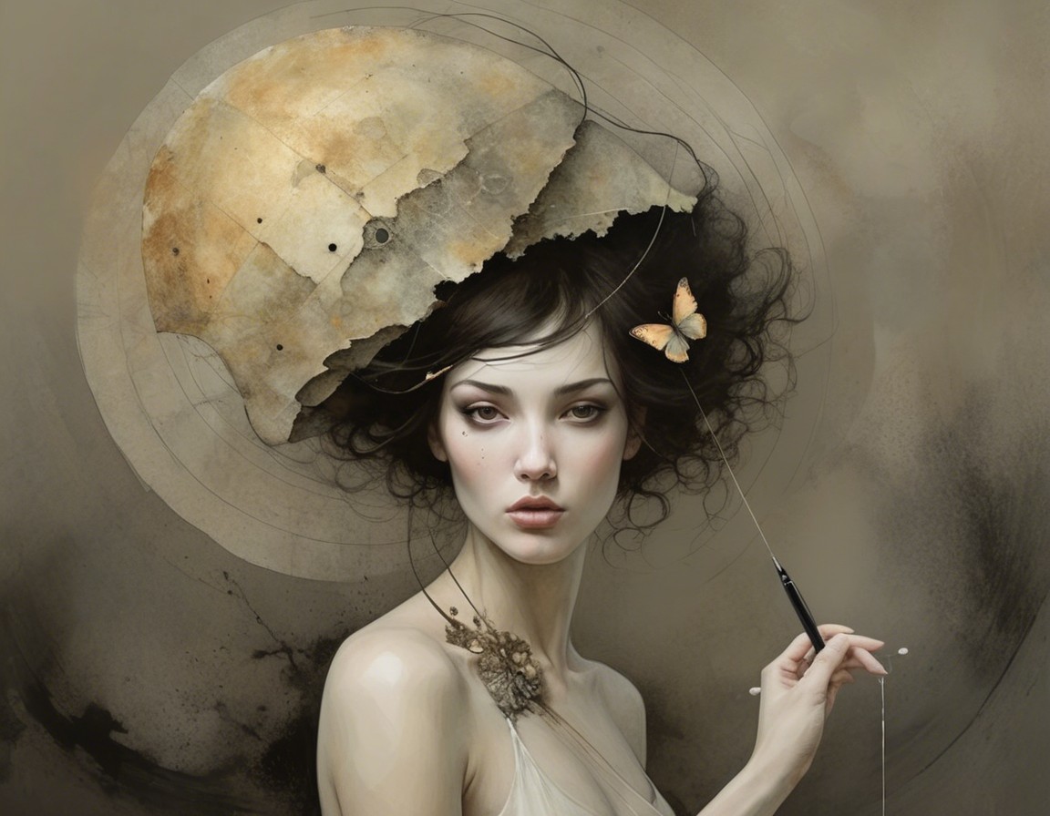 A surreal portrait of a woman with flowing hair, where a whimsical castle rests atop her head. Ethereal elements surround her, blending fantasy and reality in a dreamlike atmosphere.