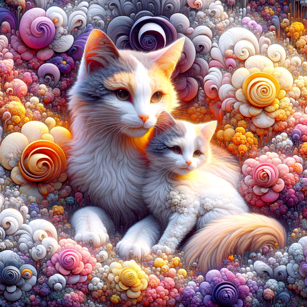 A vibrant digital artwork of two fluffy cats nestled among colorful, swirling patterns resembling fantasy flowers and shells.
