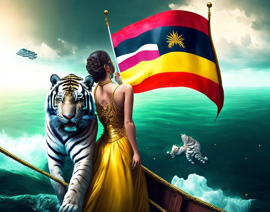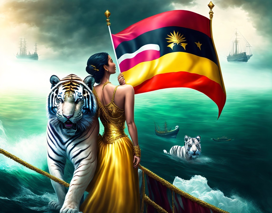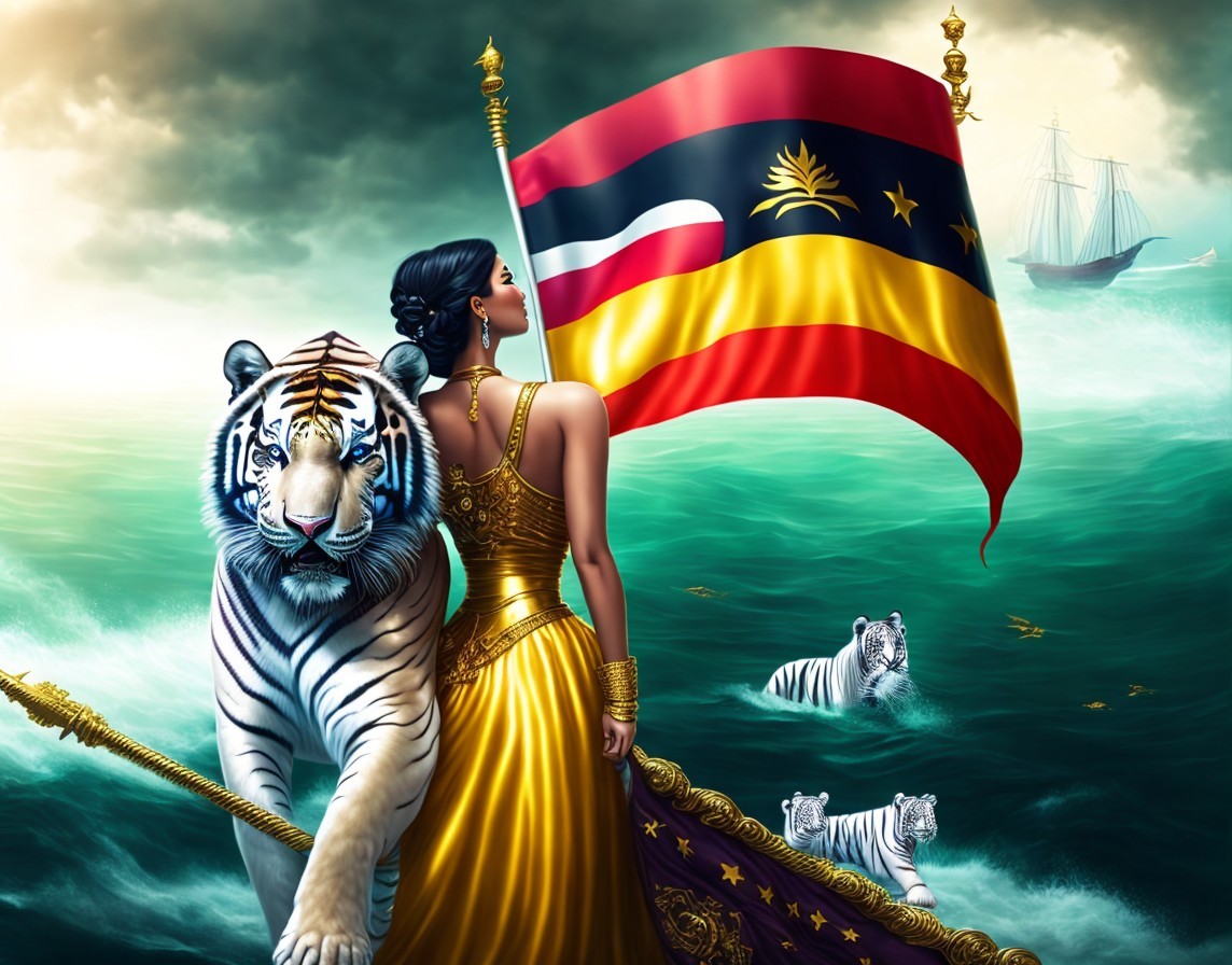 A woman in a gold dress stands on a ship with a white tiger beside her, holding a flag with a black, red, and gold design against a stormy sea backdrop.