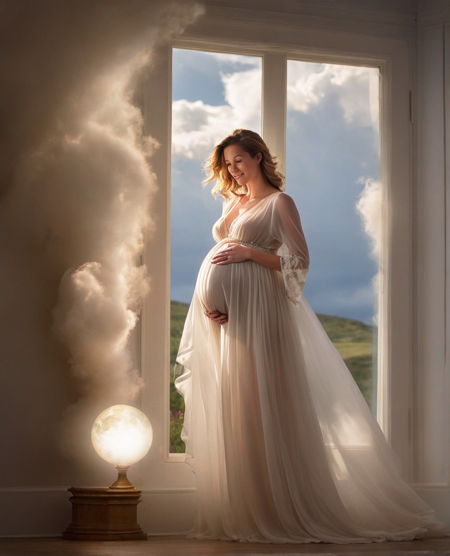 A serene woman in an elegant dress holds a glowing sphere, with a large bubble behind her, against a backdrop of a dreamy sky and landscape.