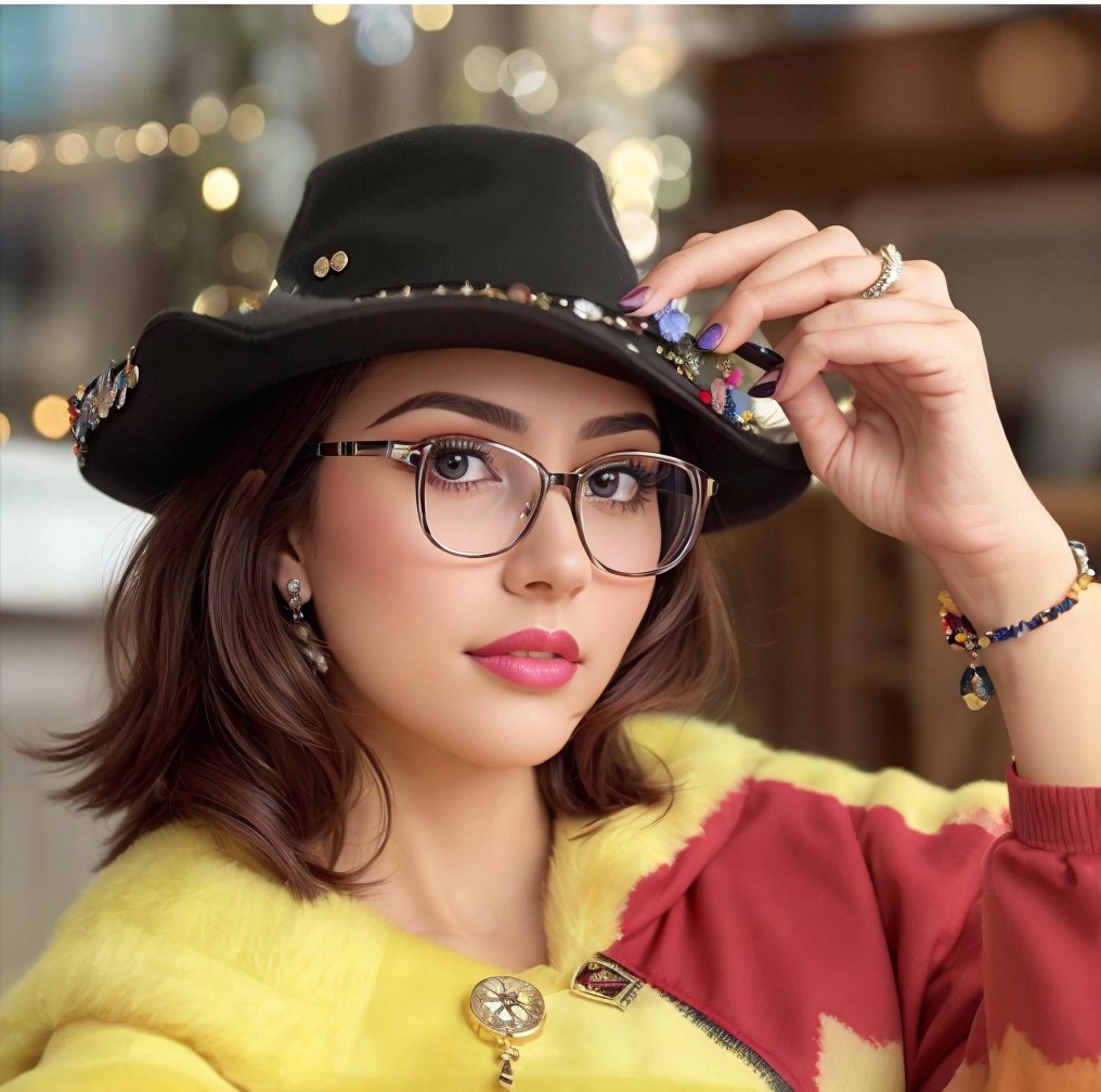 A stylish person with glasses, tipping a black hat adorned with tiny stars, wears a colorful jacket and jewelry.