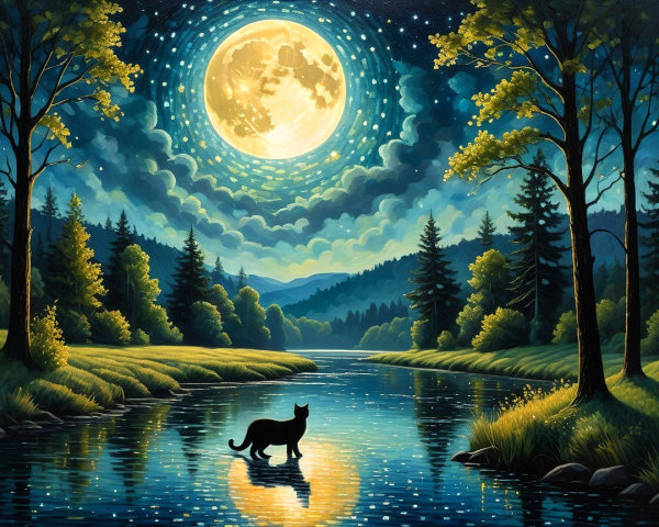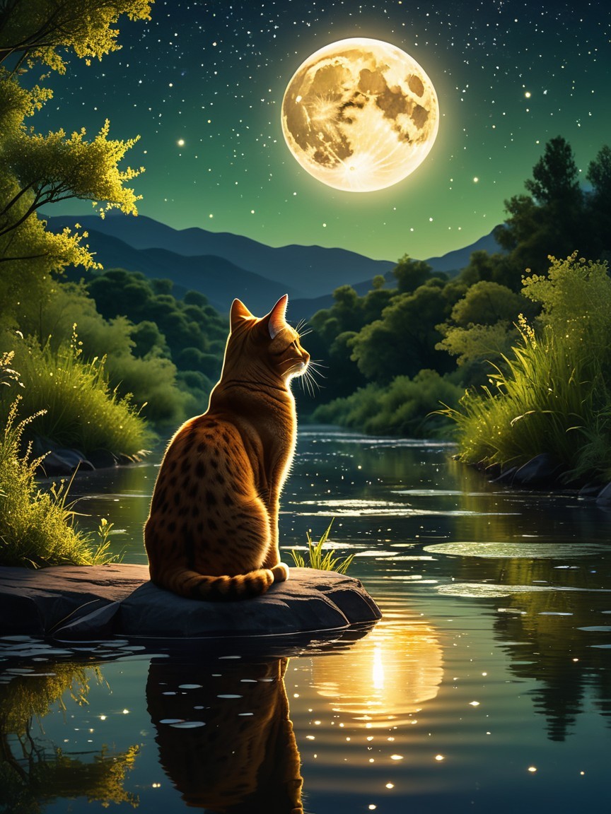 Prompt: "masterpiece, best quality, highly detailed, 8k, ultra sharp, professional, **a majestic celestial cat composed of glowing stars floating over a serene river at night**, starry cat made of golden light, glowing feline silhouette, intricate details, **night sky with a full moon casting a soft glow**, river reflecting the starlight, tranquil waters, lush green vegetation along the riverbanks, trees silhouetted against the night sky, **ethereal ambiance**, Impressionistic art style, soft lighting, dark teal and golden color scheme, low angle perspective, magical realism, dreamlike scene"