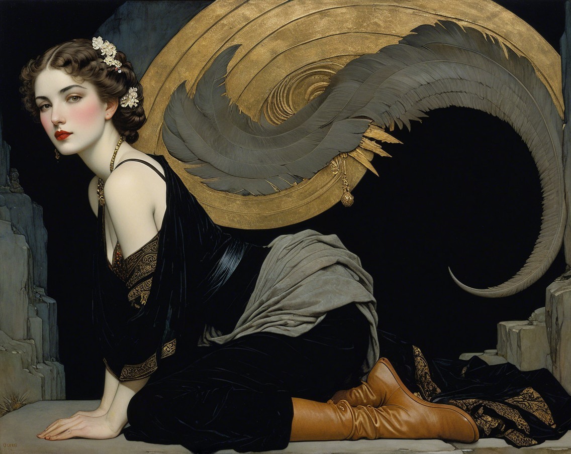 The image features a striking contrast between a woman in a flowing black dress and a muscular man, set against a serene beach backdrop, evoking emotions of intimacy and allure.